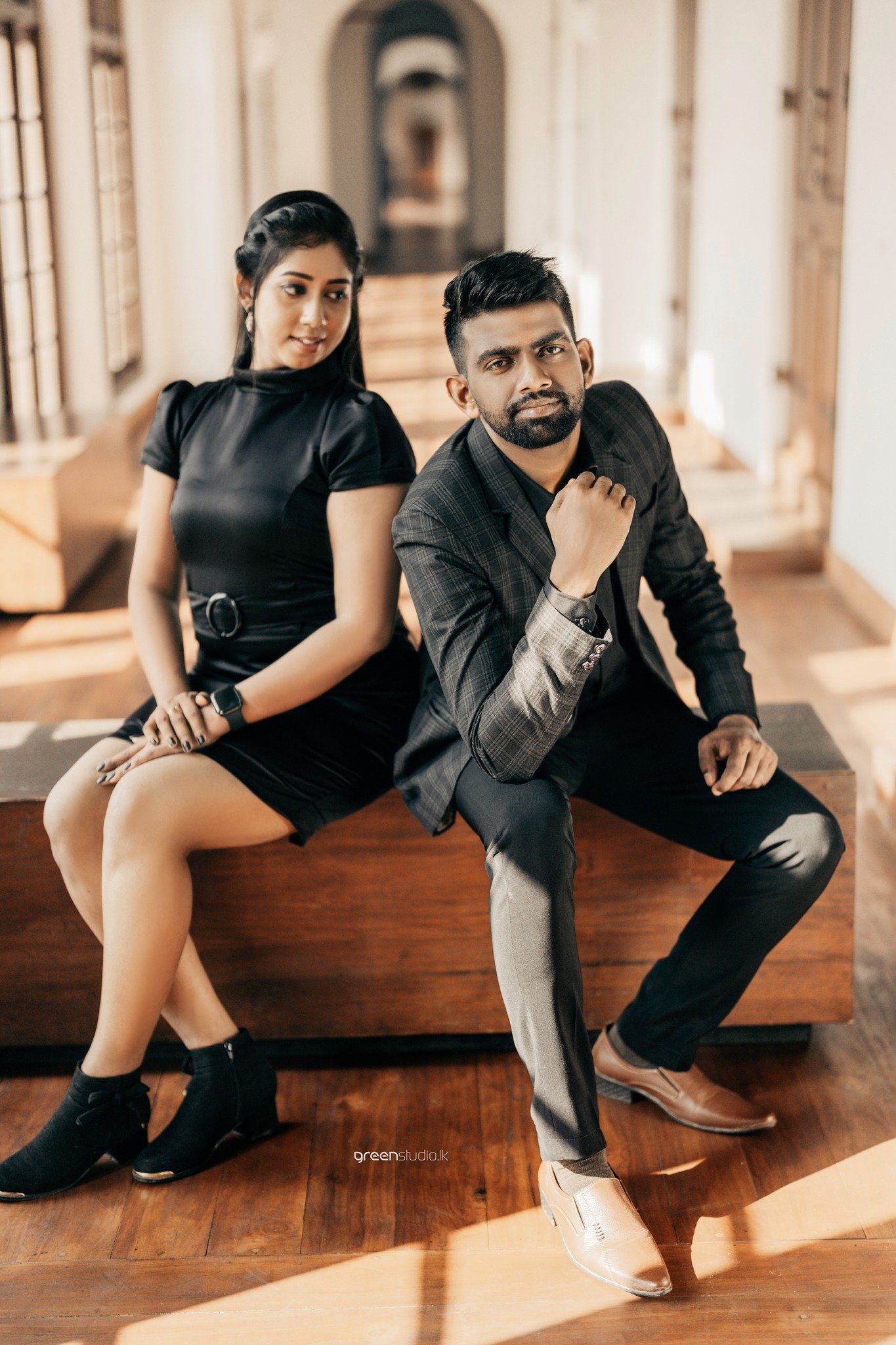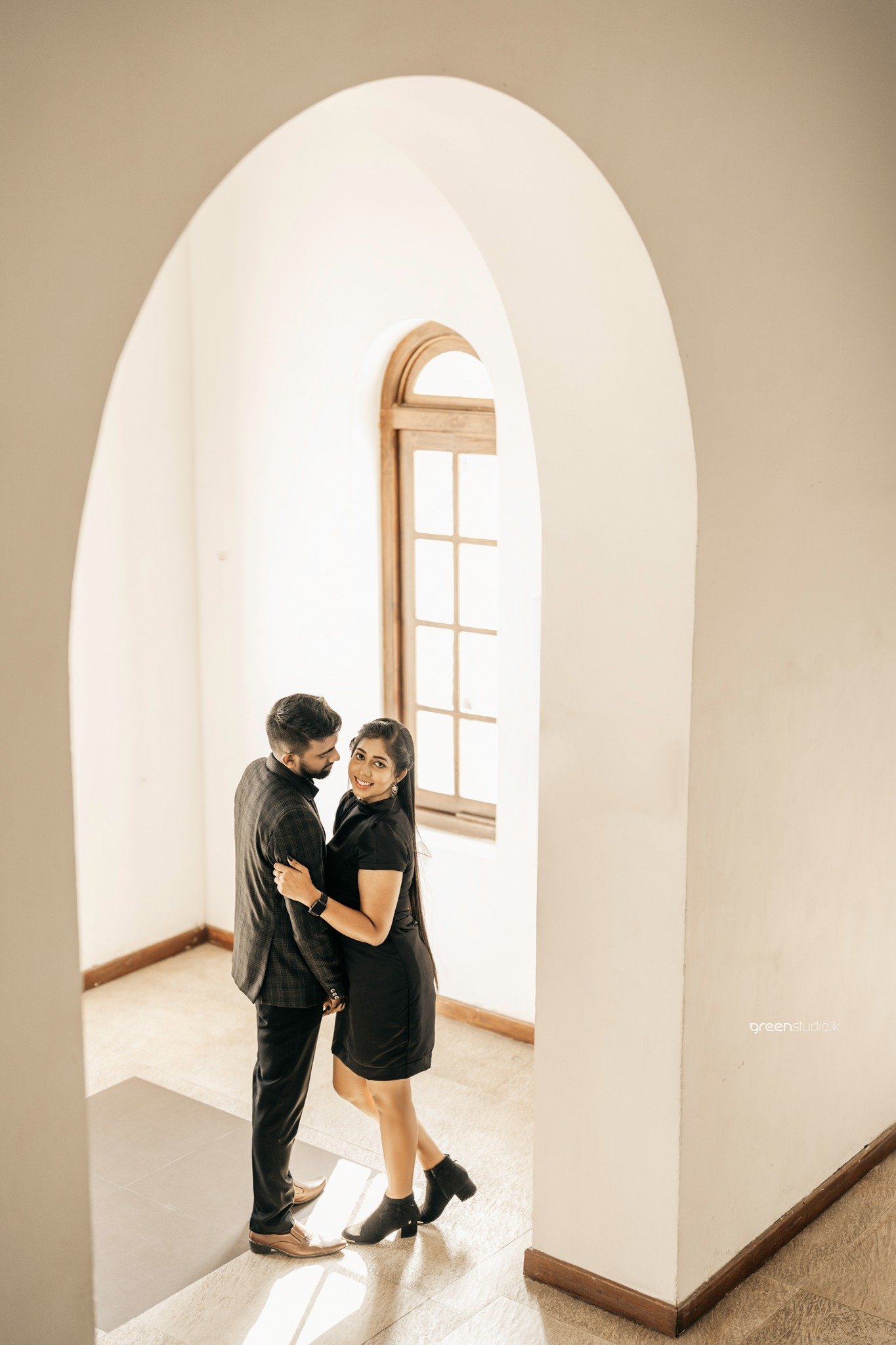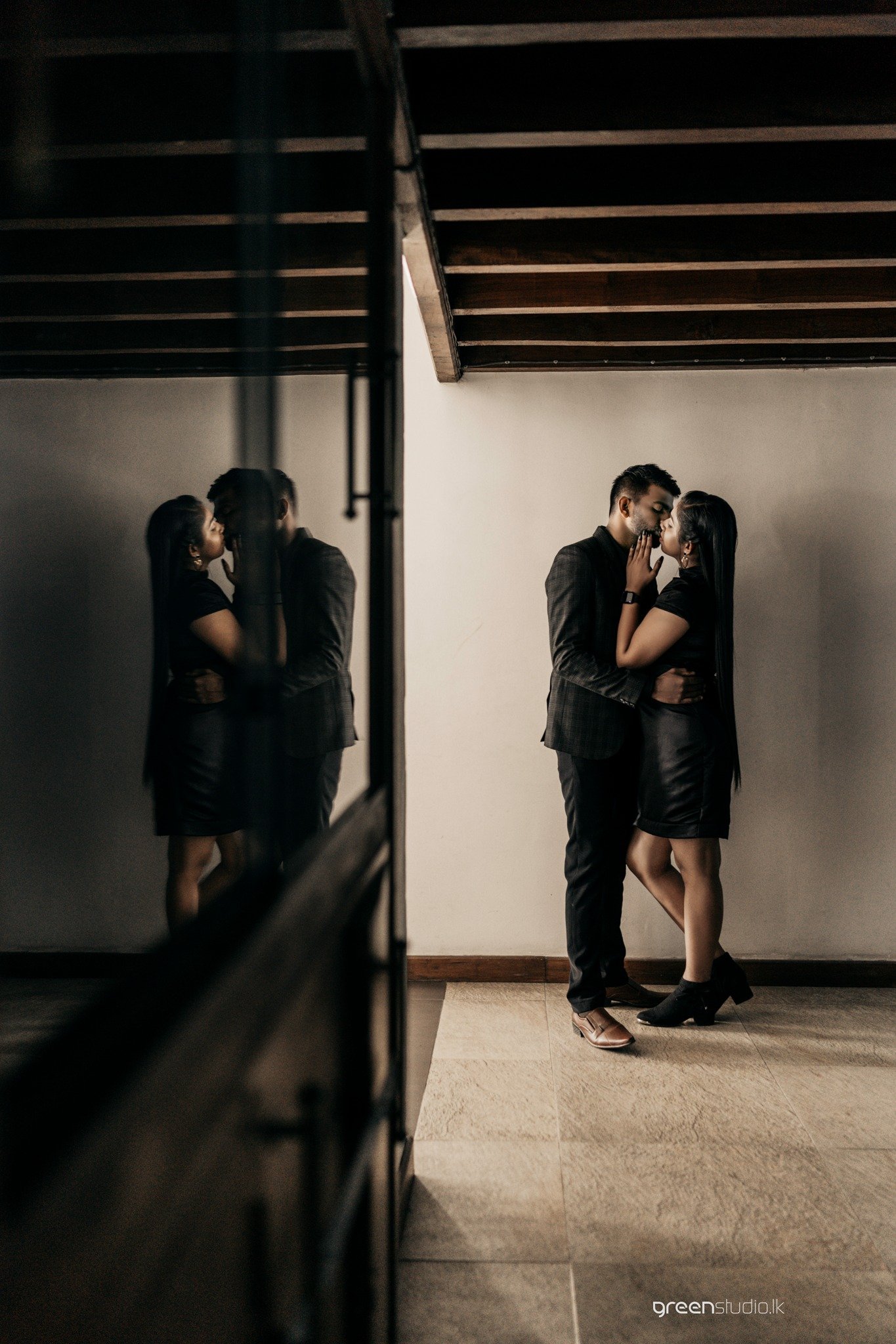 They arrived dressed in quiet confidence—black on black—letting the light do the talking. A first embrace happens against a clean wall, their silhouettes doubled in the glass like a secret only mirrors keep. They wander through arched corridors and tall wooden windows, pausing to listen to the building breathe. She lifts her chin to the window glow; he answers with a grin that softens the room.
