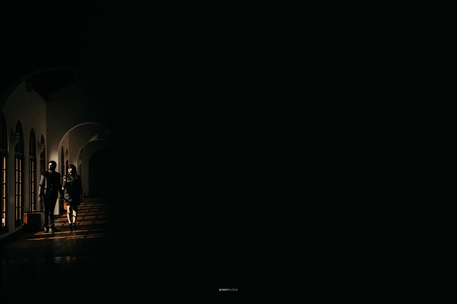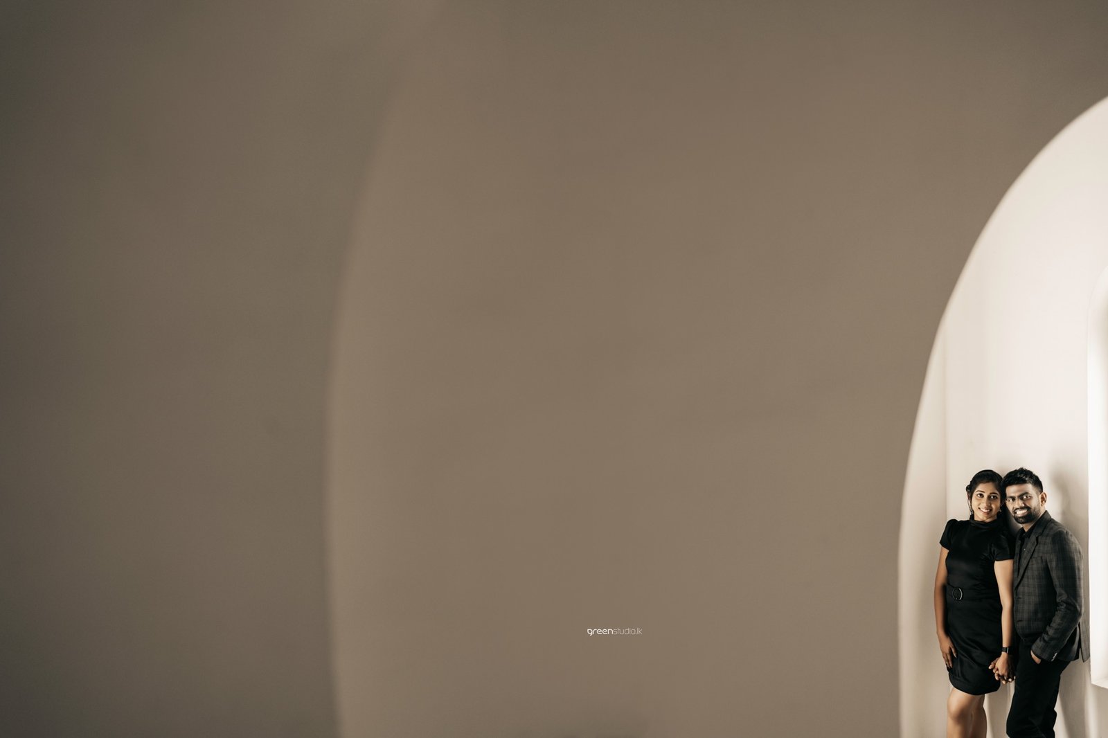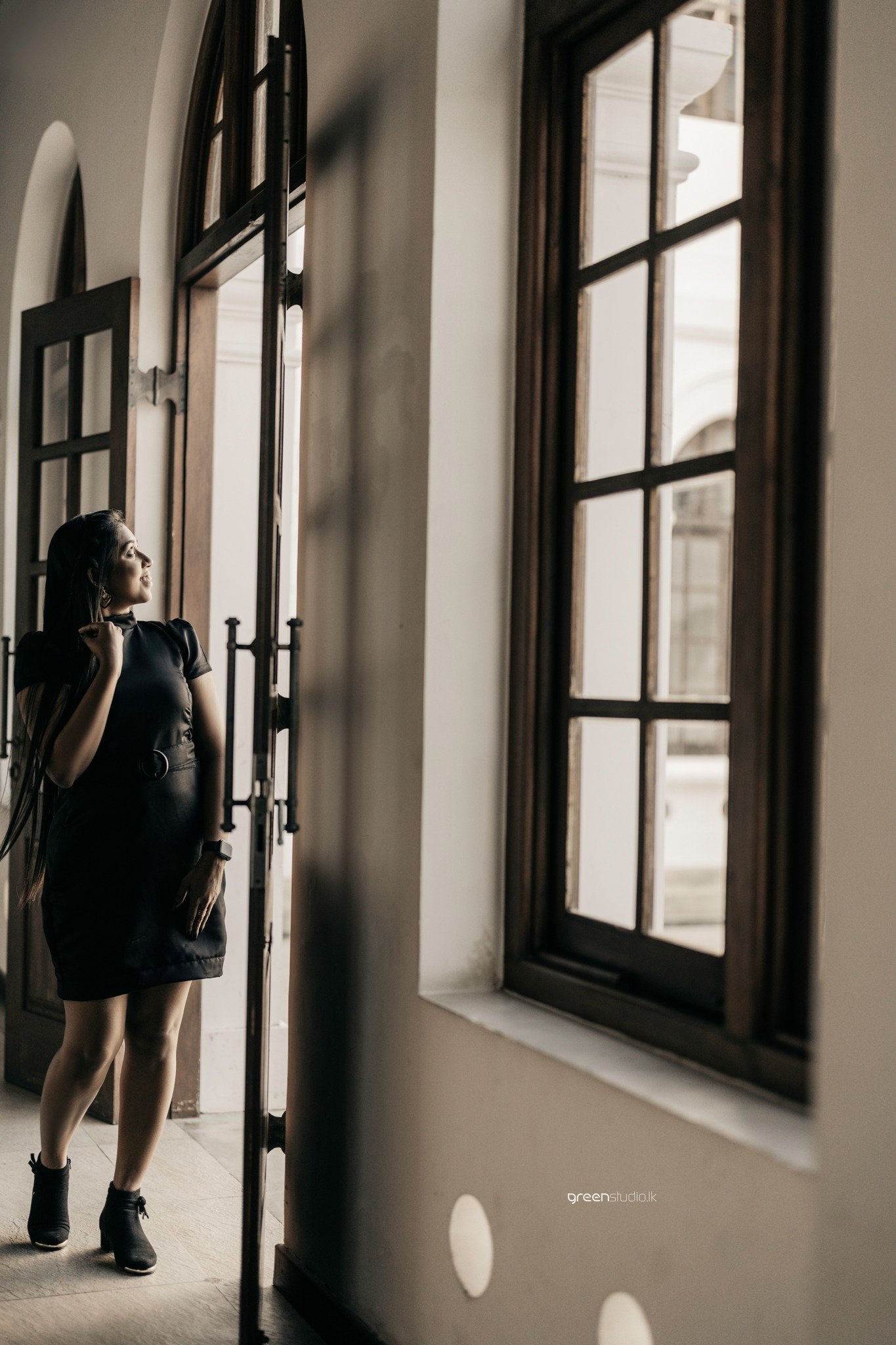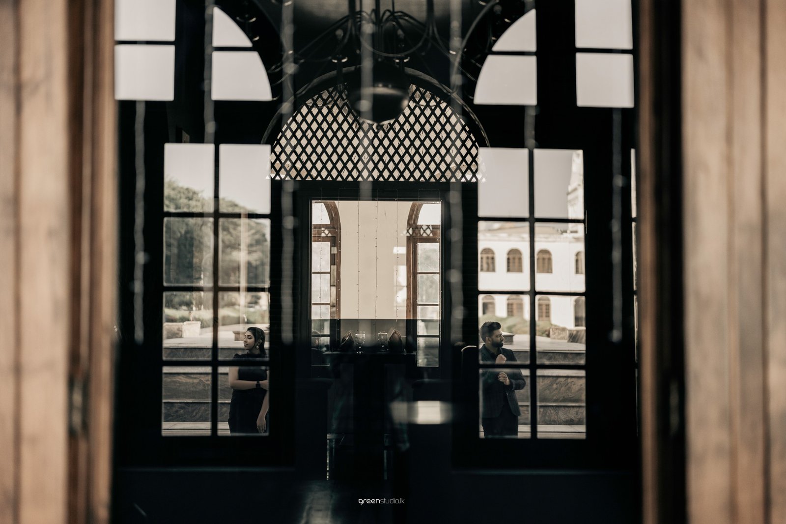 They arrived dressed in quiet confidence—black on black—letting the light do the talking. A first embrace happens against a clean wall, their silhouettes doubled in the glass like a secret only mirrors keep. They wander through arched corridors and tall wooden windows, pausing to listen to the building breathe. She lifts her chin to the window glow; he answers with a grin that softens the room.