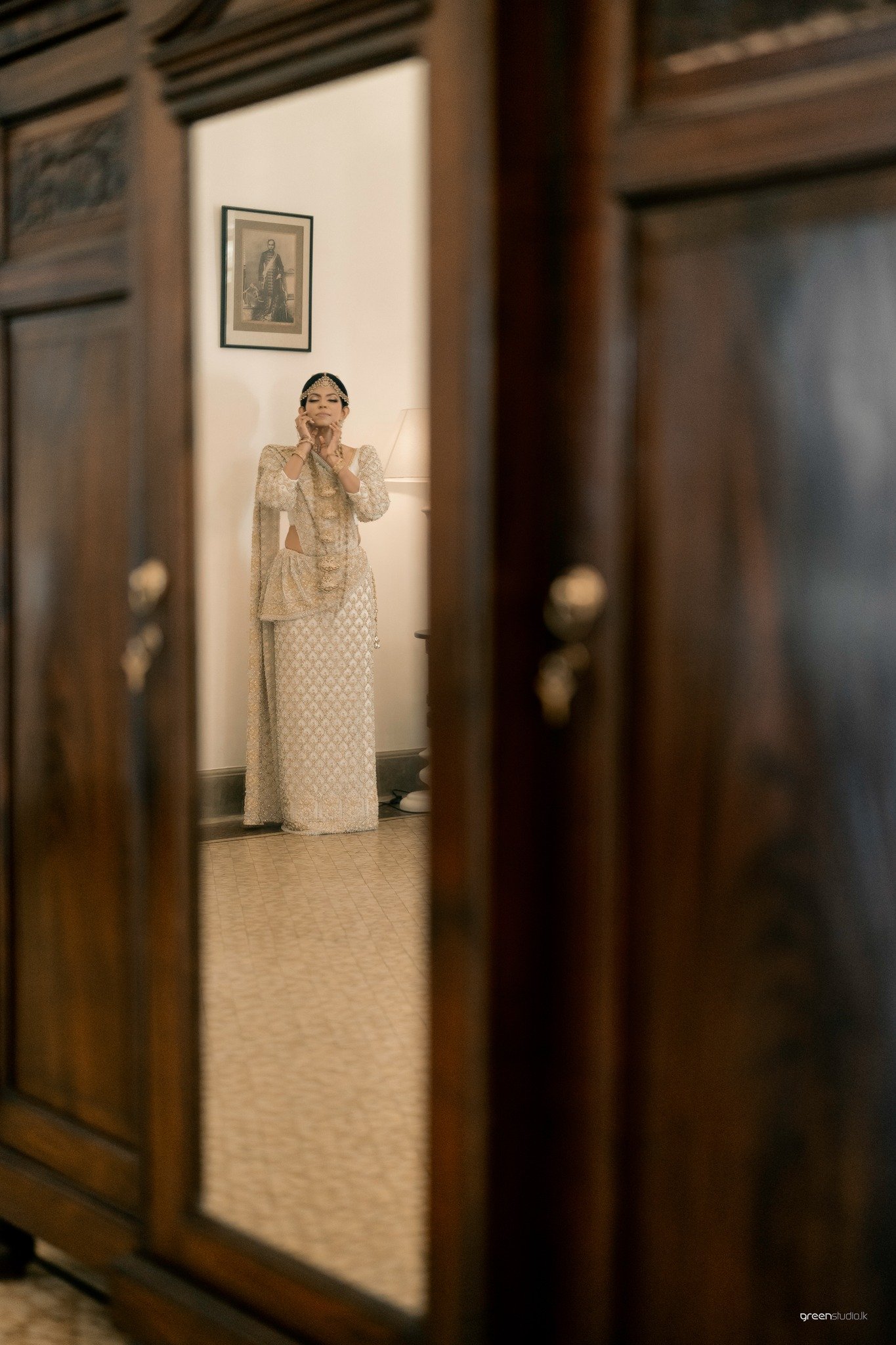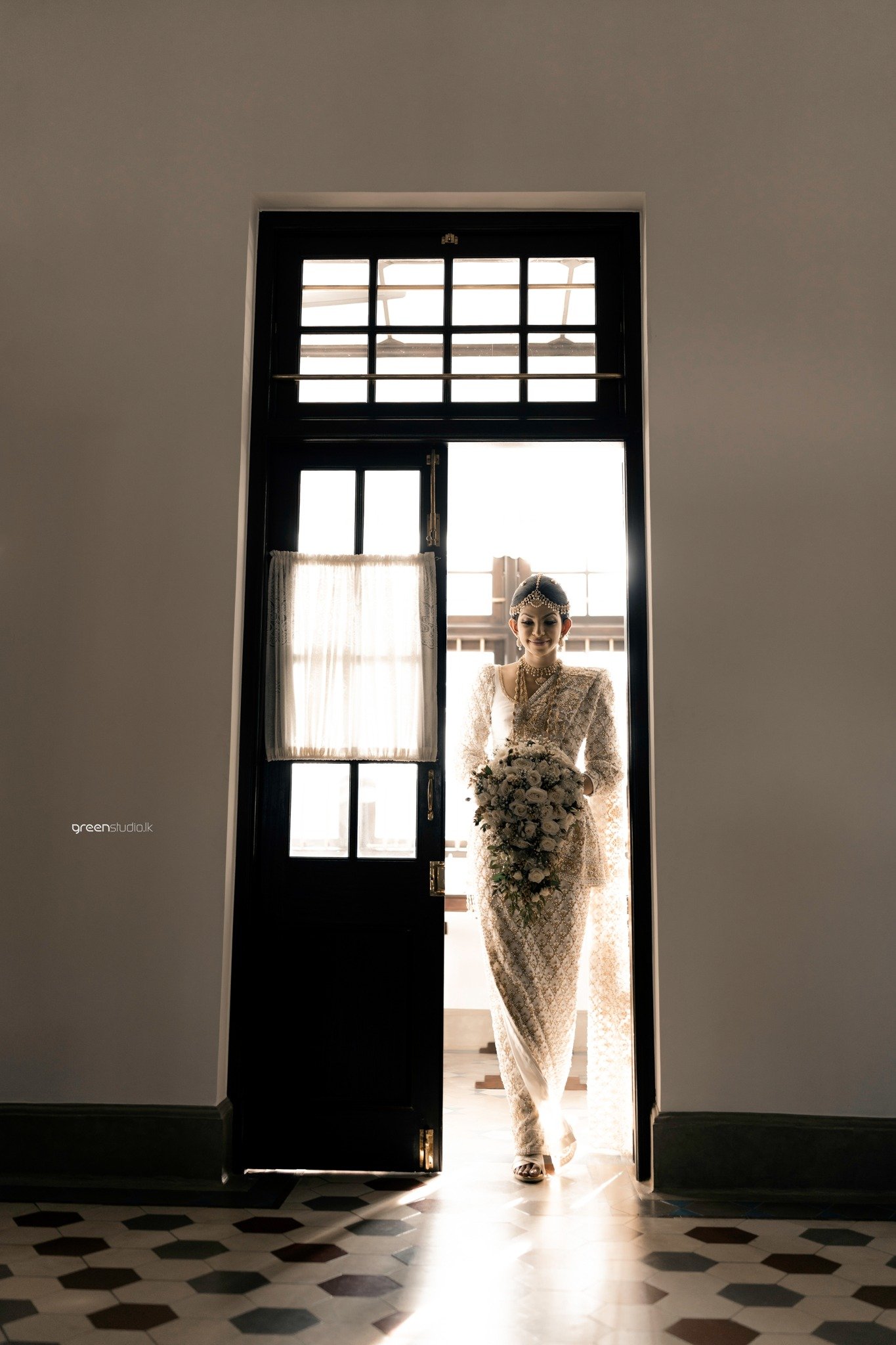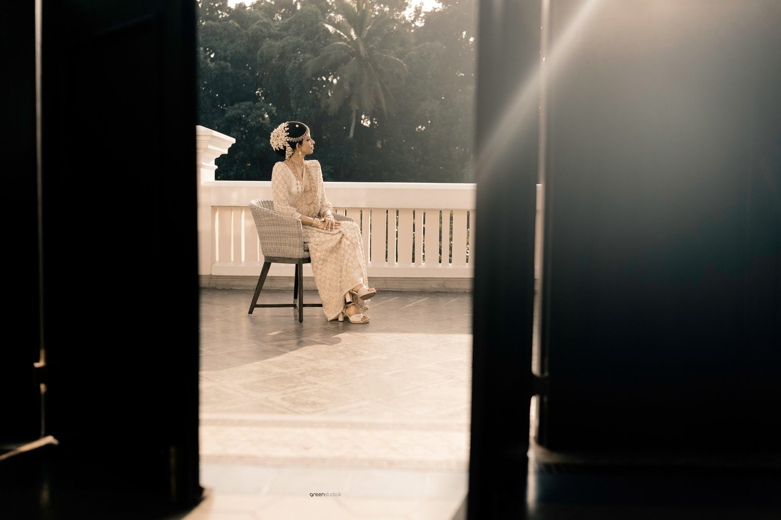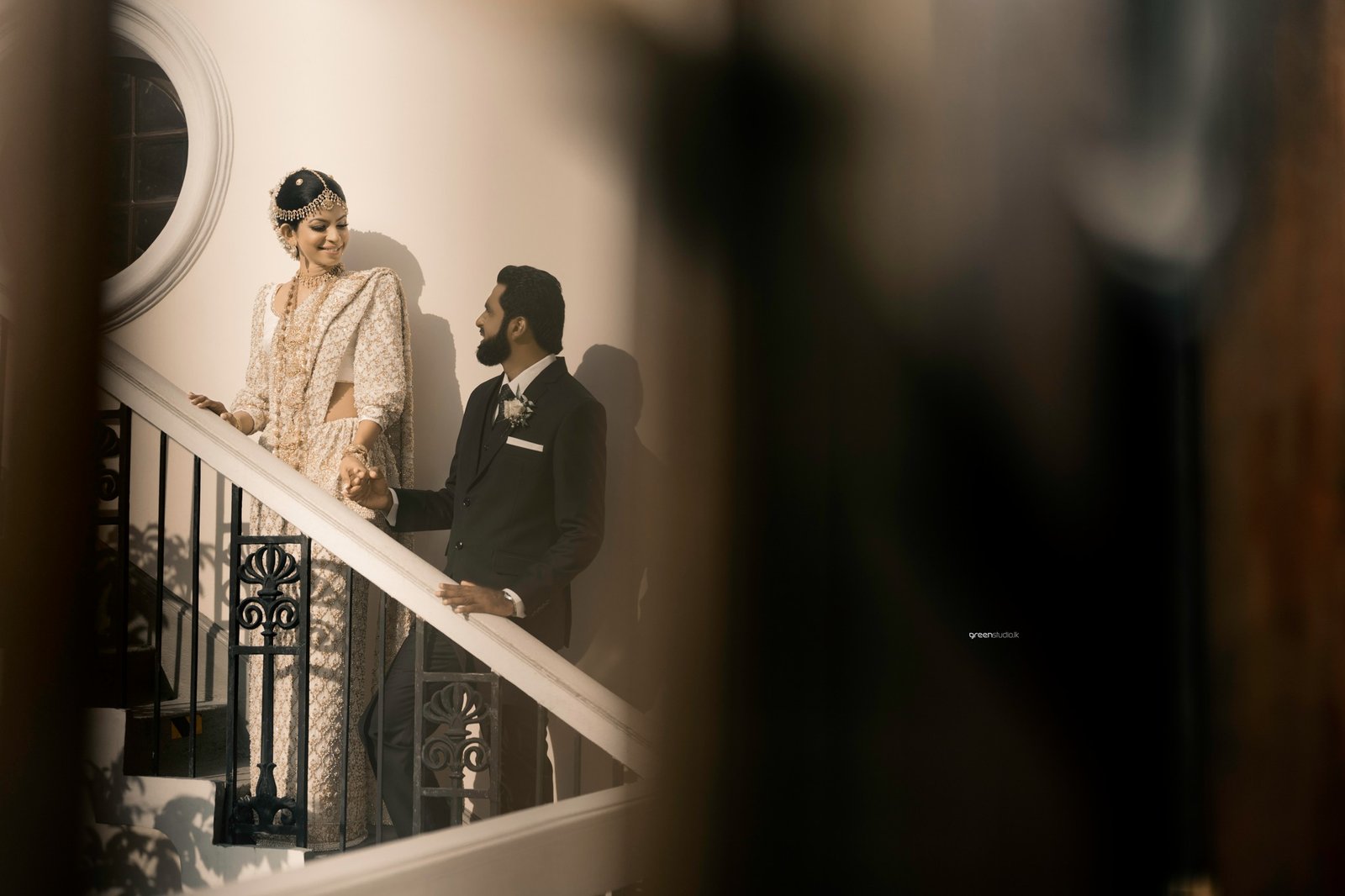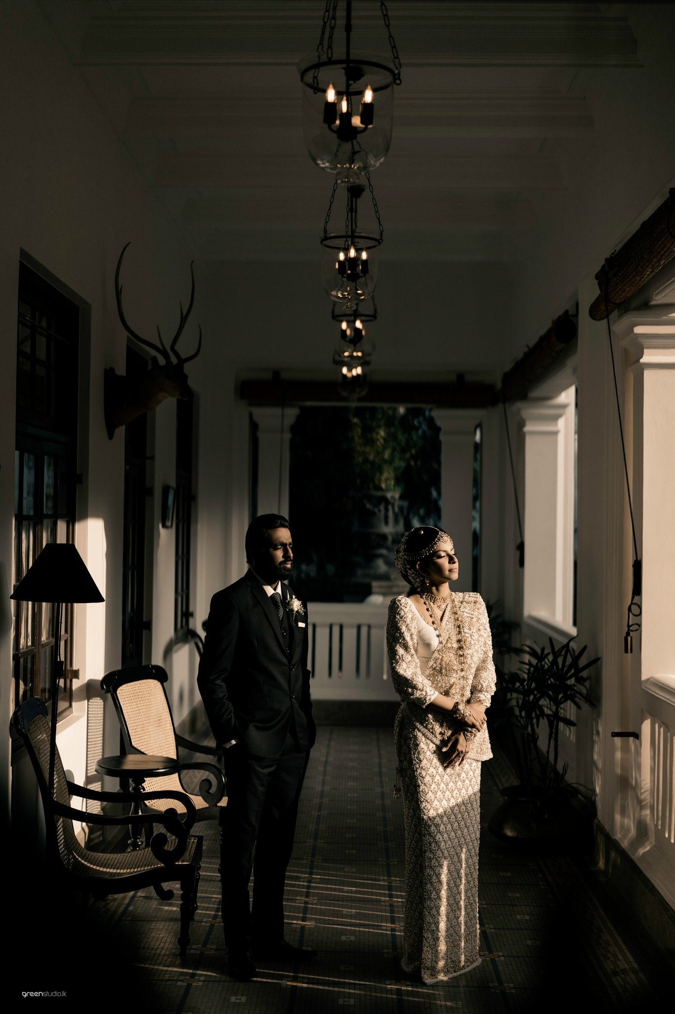 Morning light slips through the old doors and finds her first—poised on the veranda, jasmine pinned to a classic Kandyan bun, goldwork catching every ray. He waits along the colonnade where lanterns hang and antlers watch, and together they borrow the house’s quiet elegance: framed in doorways, traced by shadows, held by stair rails that have kept a thousand secrets. She laughs while fastening bangles; he steadies her hand on the steps. Mirrors gift soft reflections, corridors paint them in stripes of light, and the garden hums just beyond the balustrade. It’s a study in texture and tenderness—hand-beaded saree, crisp suit, white roses, warm stone—woven with glances that say everything. From first light to the last long shadow, this session is heritage wrapped in glow: intimate, graceful, unmistakably theirs.