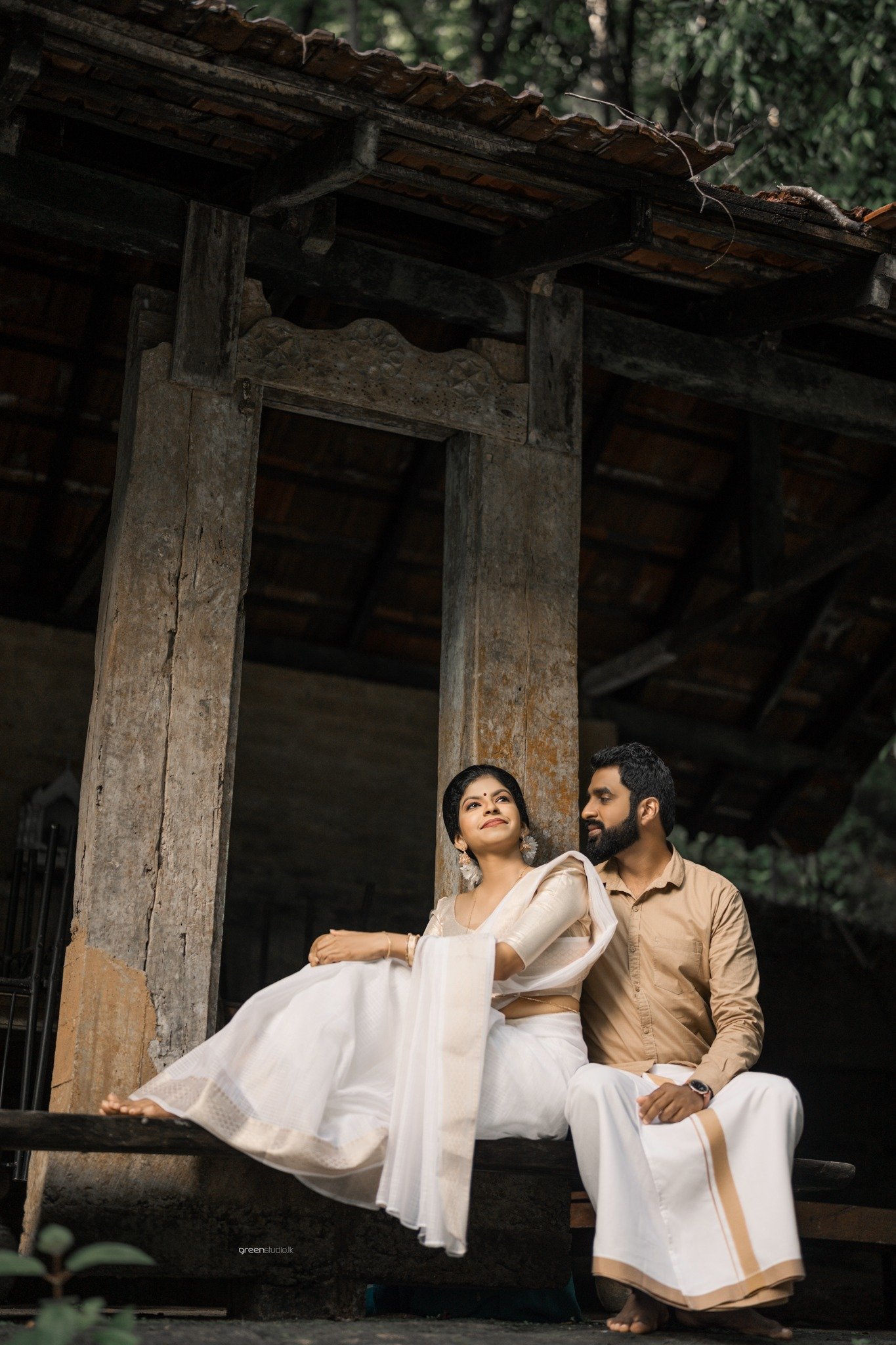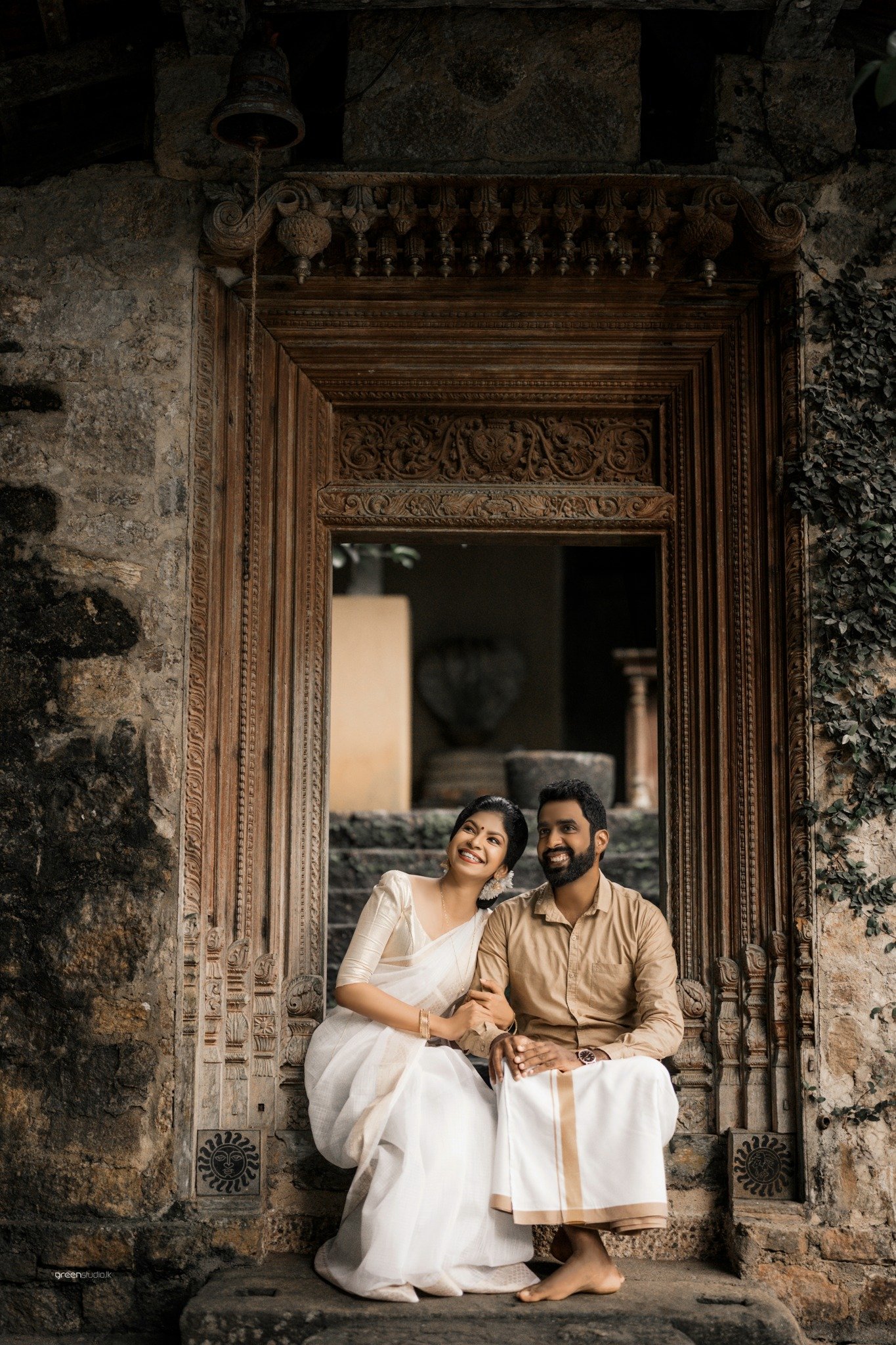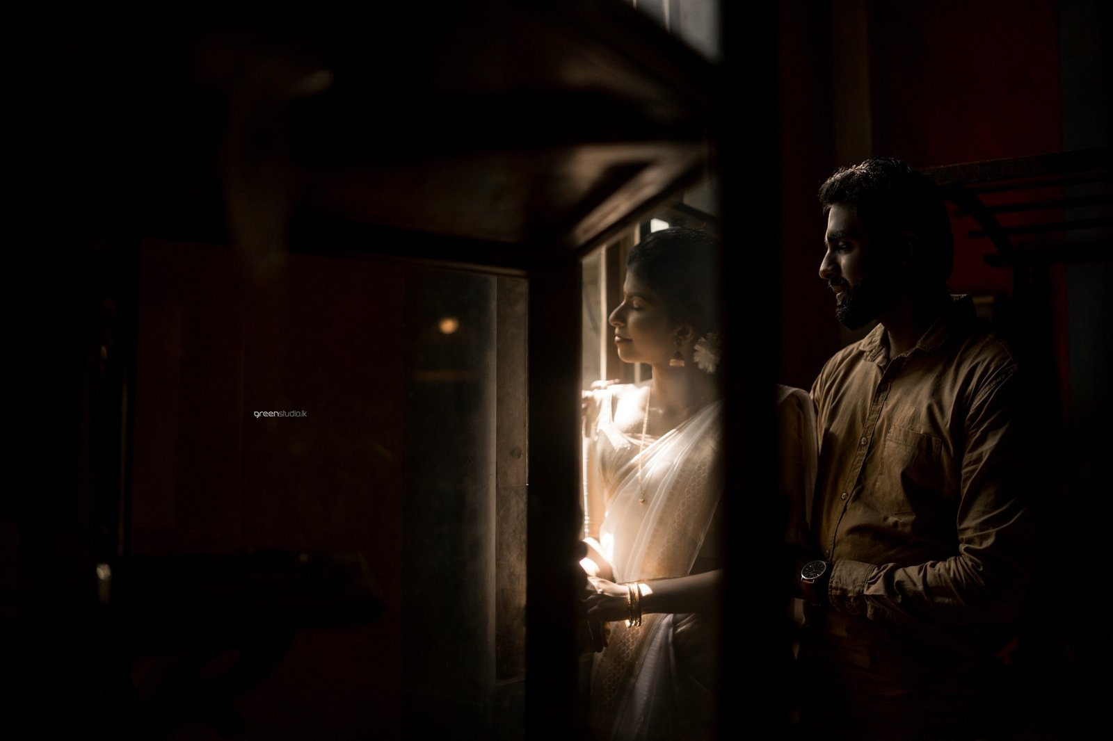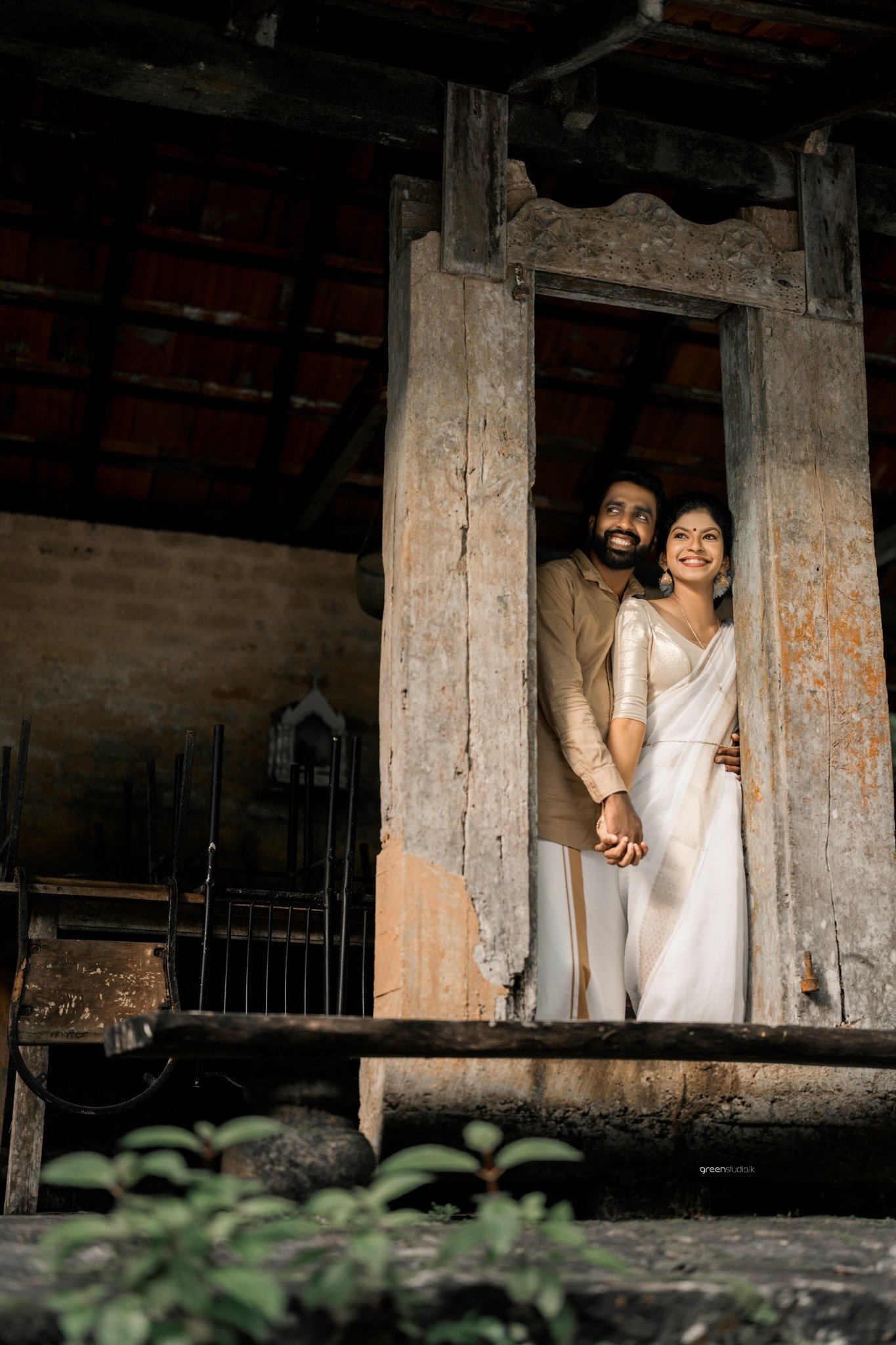 They slip into a quiet, timeworn house and let the day slow down. On the veranda, bare feet and easy smiles; inside, a wicker lamp paints them in warm light while their reflections linger on the glass. She glows in a white-and-gold saree, he steadies her with a soft glance—two silhouettes that fit. Between wooden beams, window light, and whispering leaves, it’s simple: a calm afternoon, a gentle promise, and love that feels like home.