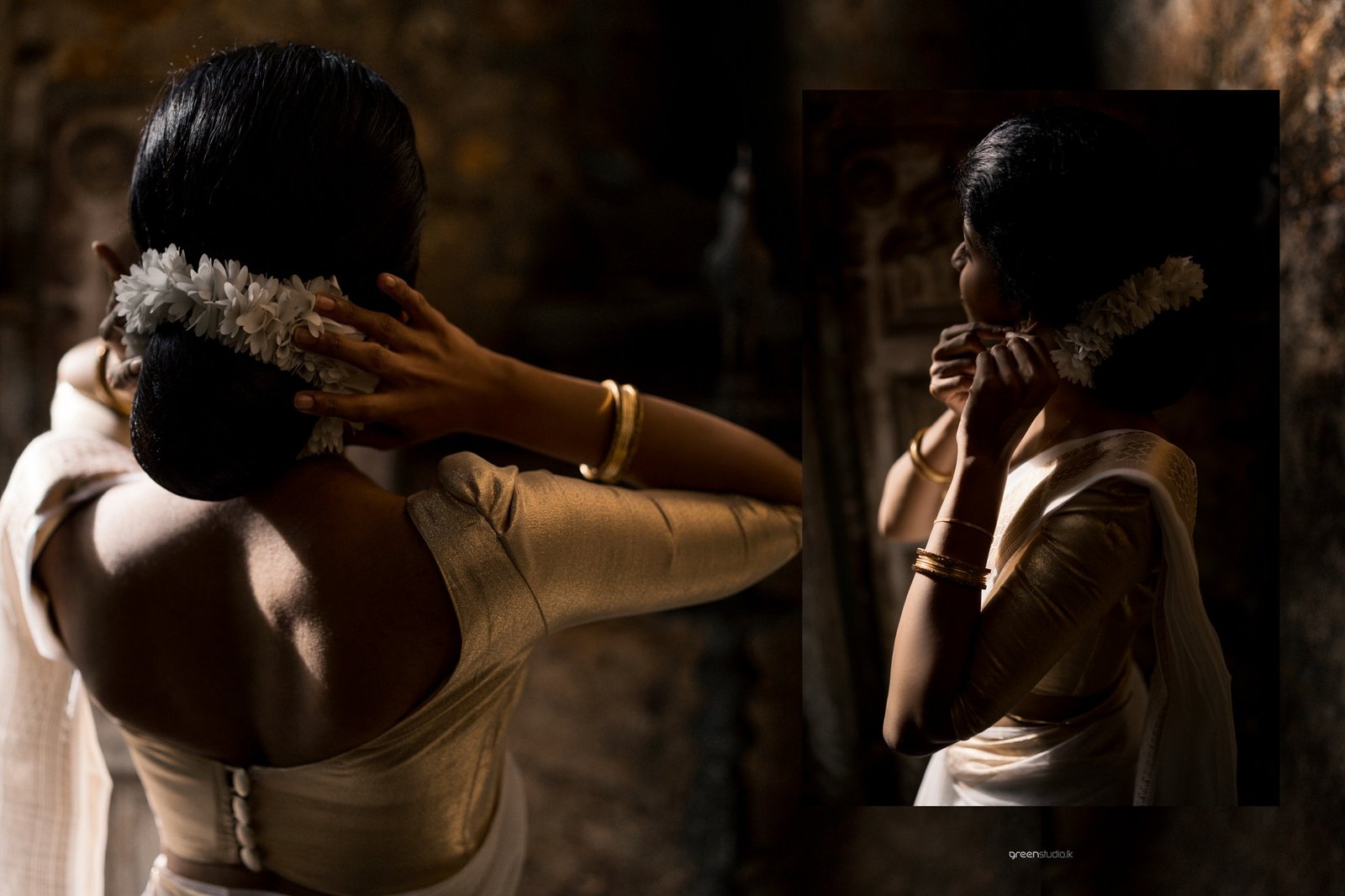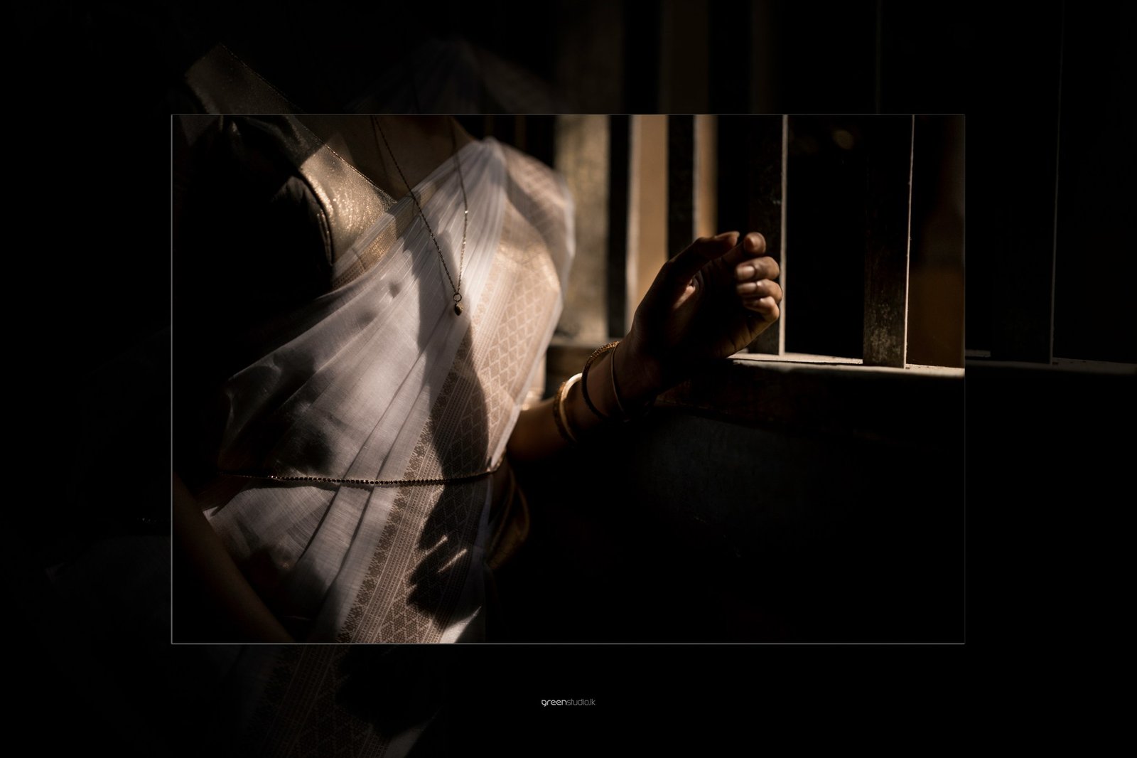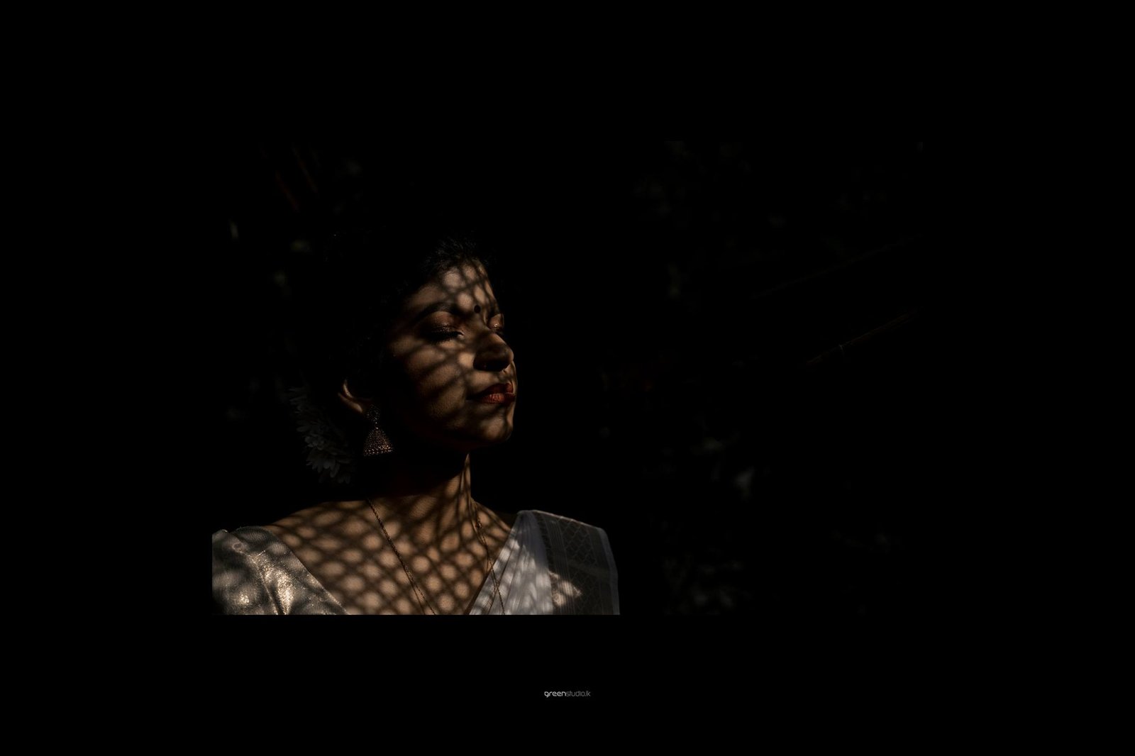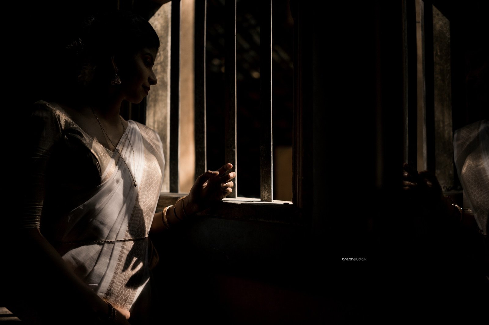 They slip into a quiet, timeworn house and let the day slow down. On the veranda, bare feet and easy smiles; inside, a wicker lamp paints them in warm light while their reflections linger on the glass. She glows in a white-and-gold saree, he steadies her with a soft glance—two silhouettes that fit. Between wooden beams, window light, and whispering leaves, it’s simple: a calm afternoon, a gentle promise, and love that feels like home.
