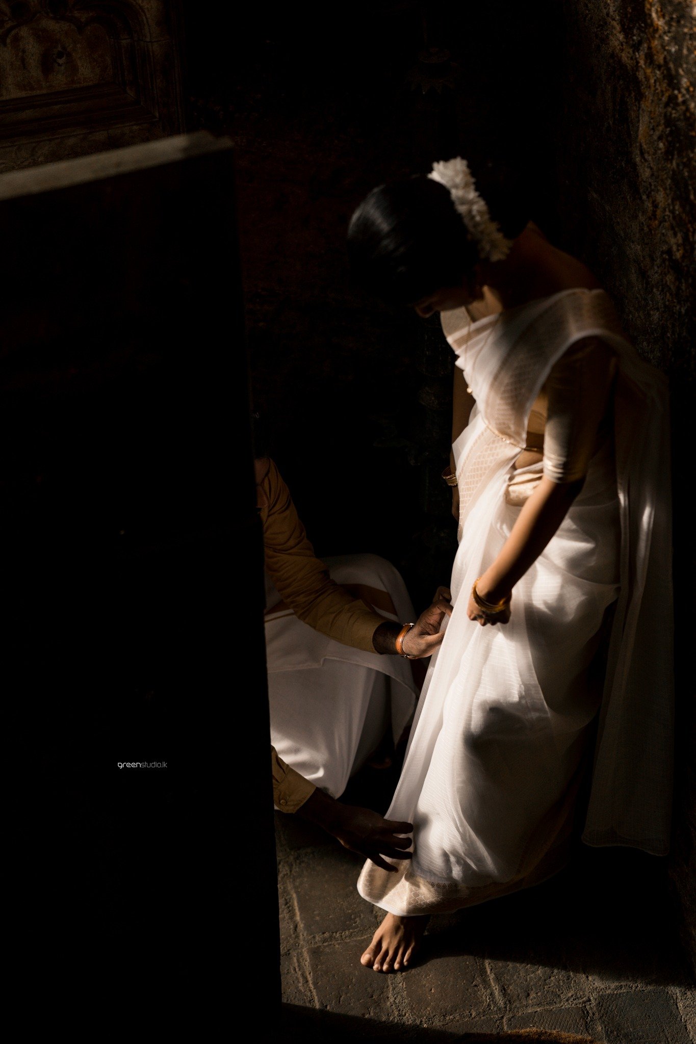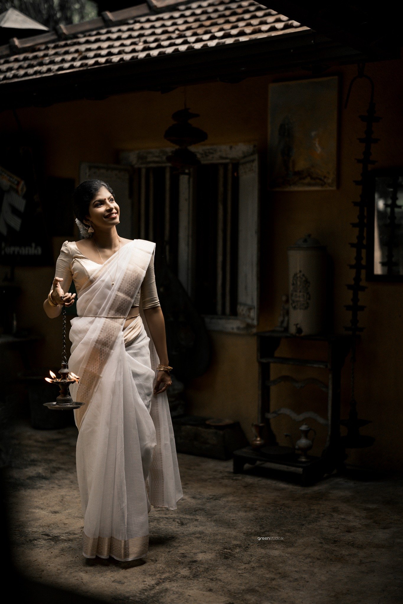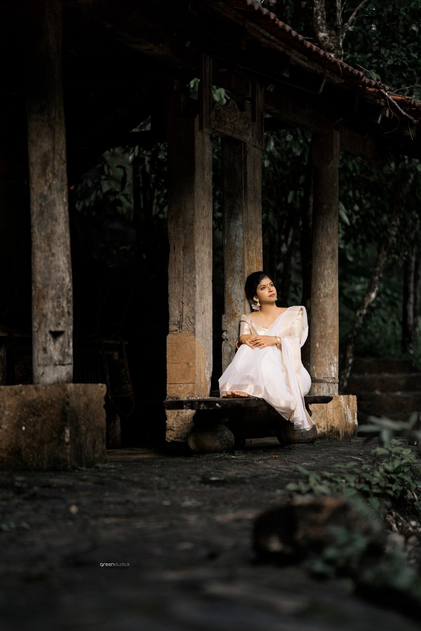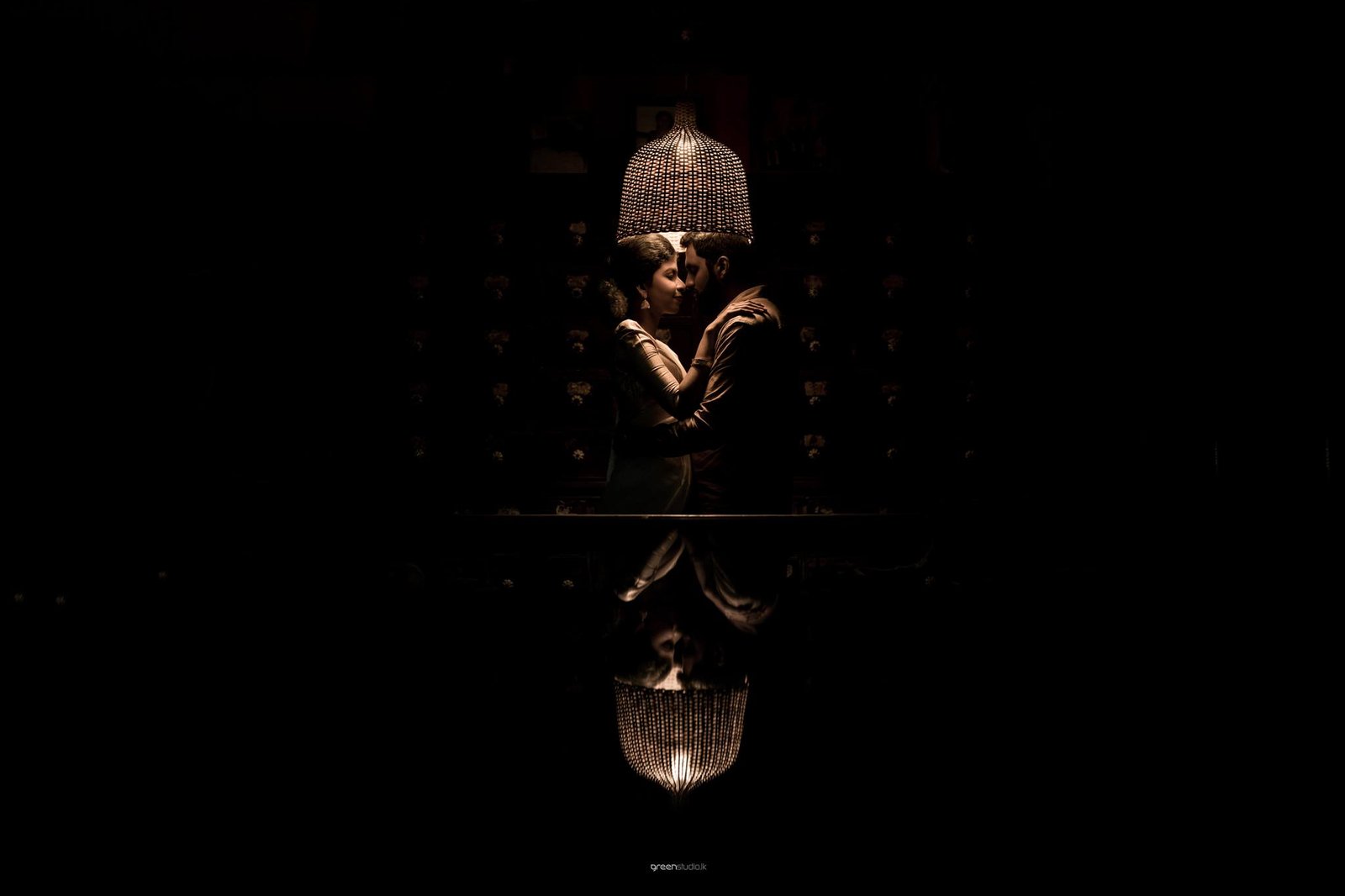 They slip into a quiet, timeworn house and let the day slow down. On the veranda, bare feet and easy smiles; inside, a wicker lamp paints them in warm light while their reflections linger on the glass. She glows in a white-and-gold saree, he steadies her with a soft glance—two silhouettes that fit. Between wooden beams, window light, and whispering leaves, it’s simple: a calm afternoon, a gentle promise, and love that feels like home.
