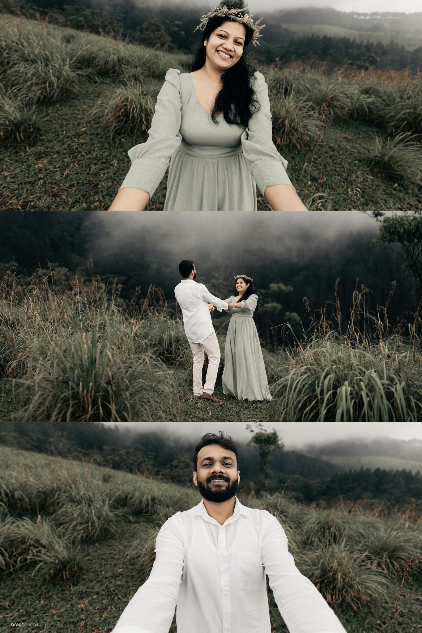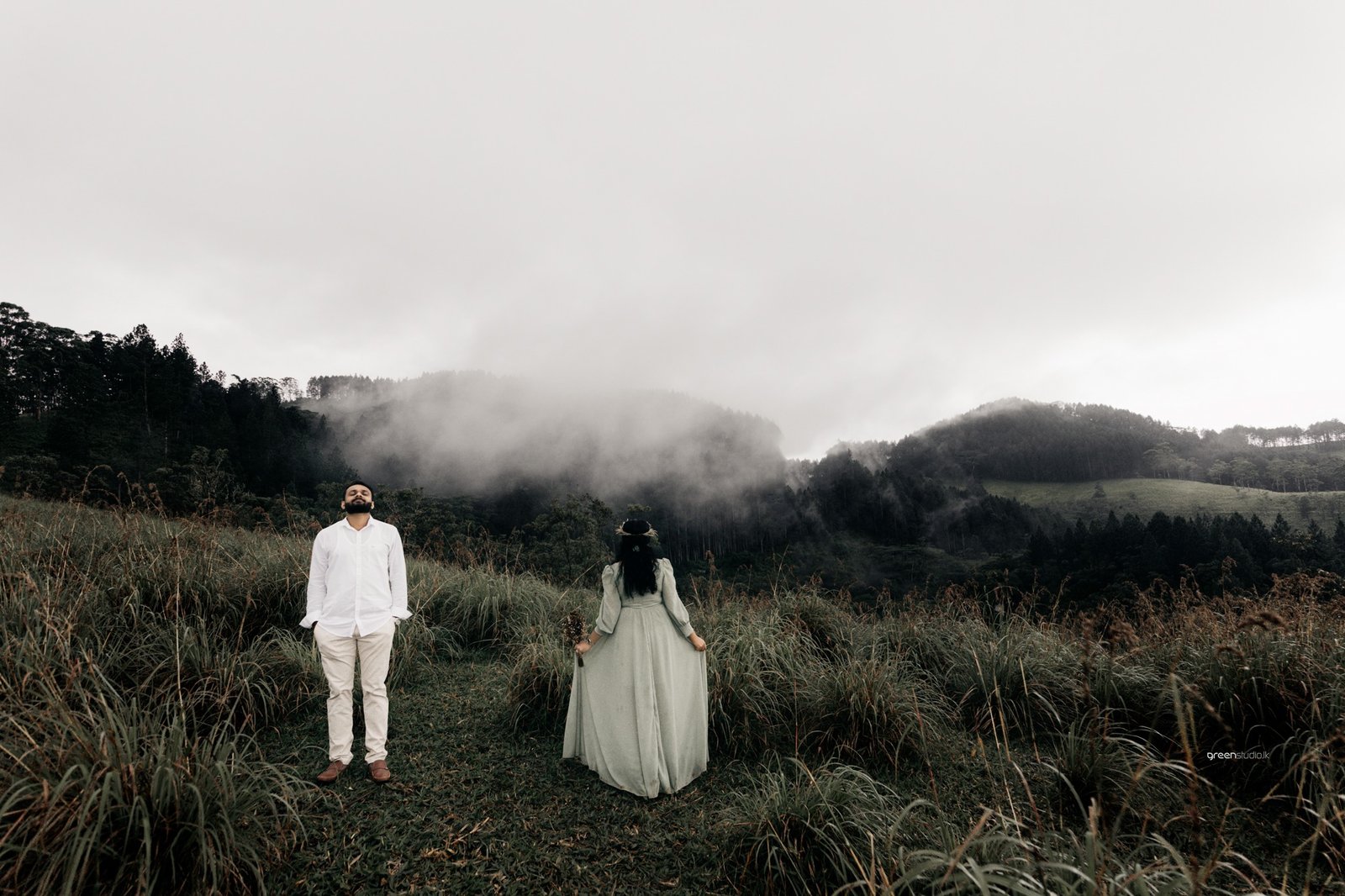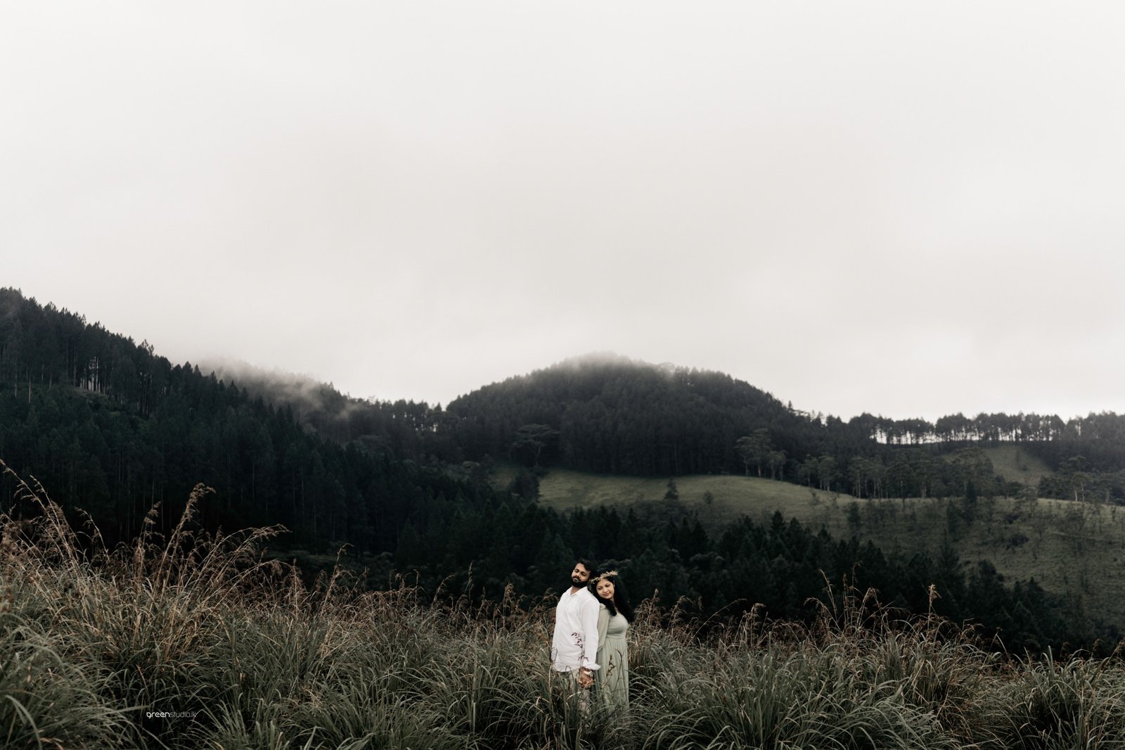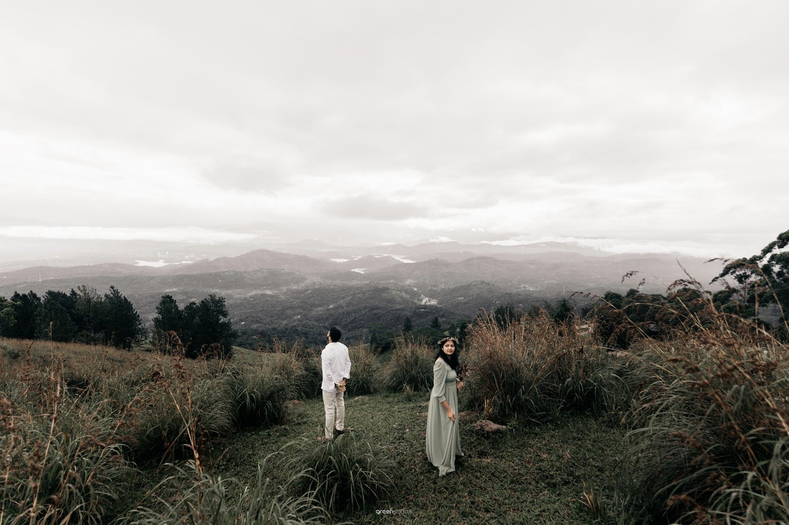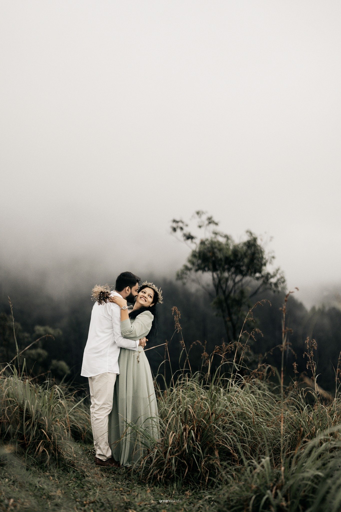 They arrived just as the mountains held their breath, grass bowed with dew and clouds drifting low. Hand in hand, they wandered into the fog, small against a sweep of ridgelines and a silver lake below. Laughter warmed the cold air—an embrace at the cliff’s edge, a crown of wild grasses tilting in the wind, his white shirt and her sage dress echoing the landscape’s calm. We paused often: for a quiet portrait among tall reeds, for a wide view where valleys rolled like waves, and for a soft double exposure that felt like two heartbeats layered as one. Every frame is simple and spacious—earth tones, honest smiles, the hush of weather—and the feeling that love, like mist, can turn a vast place intimate.