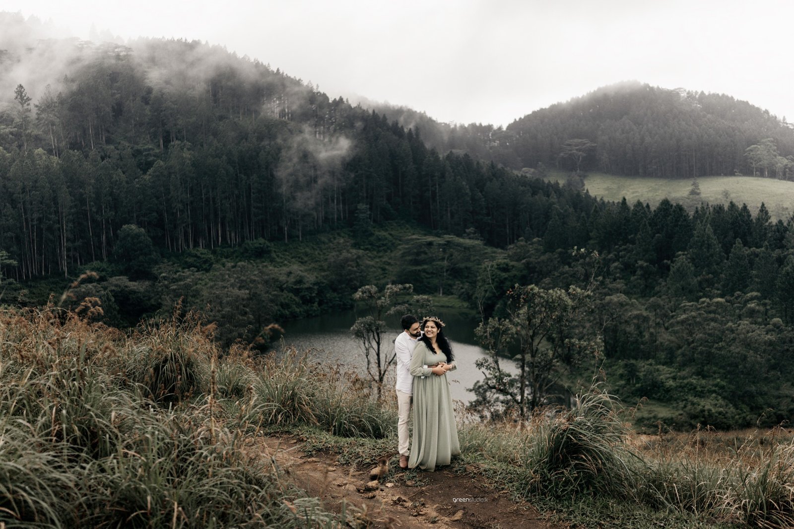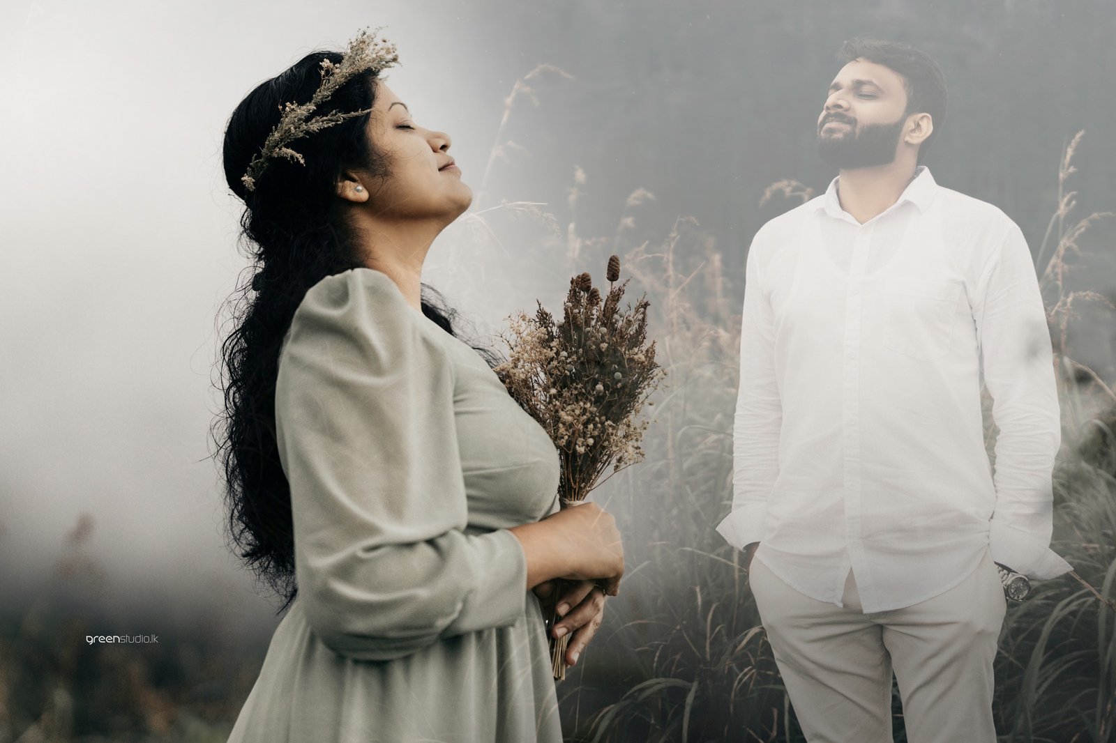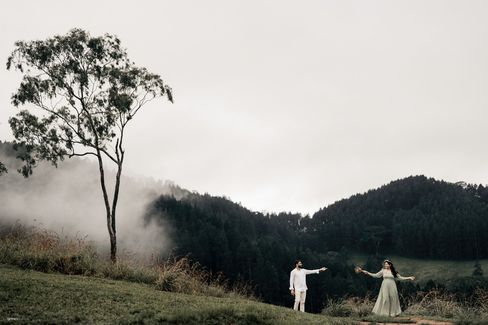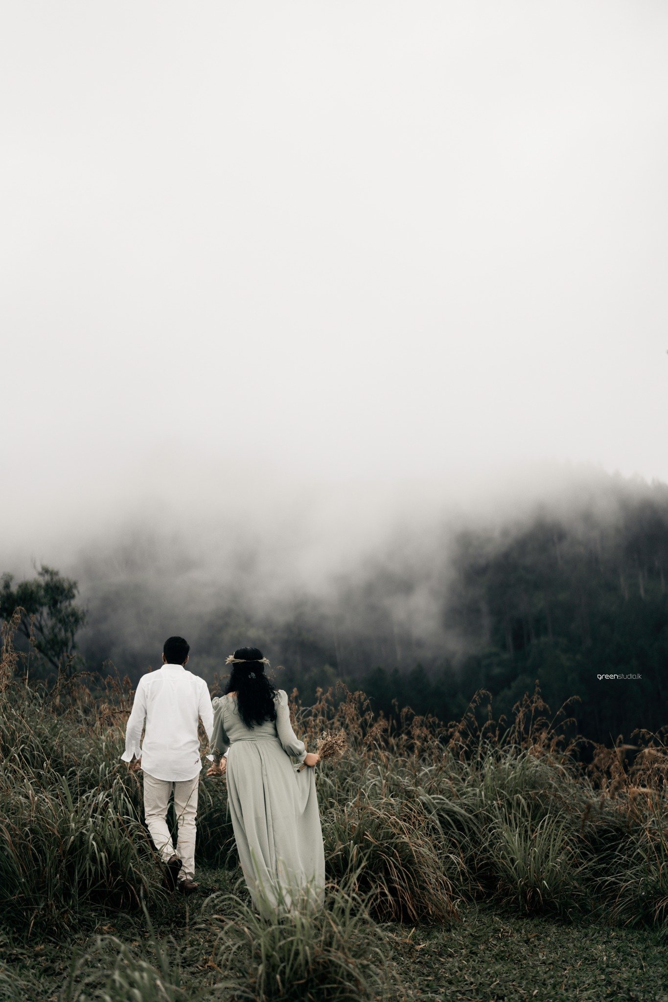 They arrived just as the mountains held their breath, grass bowed with dew and clouds drifting low. Hand in hand, they wandered into the fog, small against a sweep of ridgelines and a silver lake below. Laughter warmed the cold air—an embrace at the cliff’s edge, a crown of wild grasses tilting in the wind, his white shirt and her sage dress echoing the landscape’s calm. We paused often: for a quiet portrait among tall reeds, for a wide view where valleys rolled like waves, and for a soft double exposure that felt like two heartbeats layered as one. Every frame is simple and spacious—earth tones, honest smiles, the hush of weather—and the feeling that love, like mist, can turn a vast place intimate.