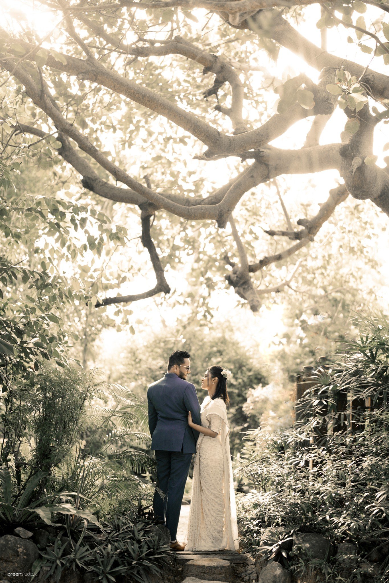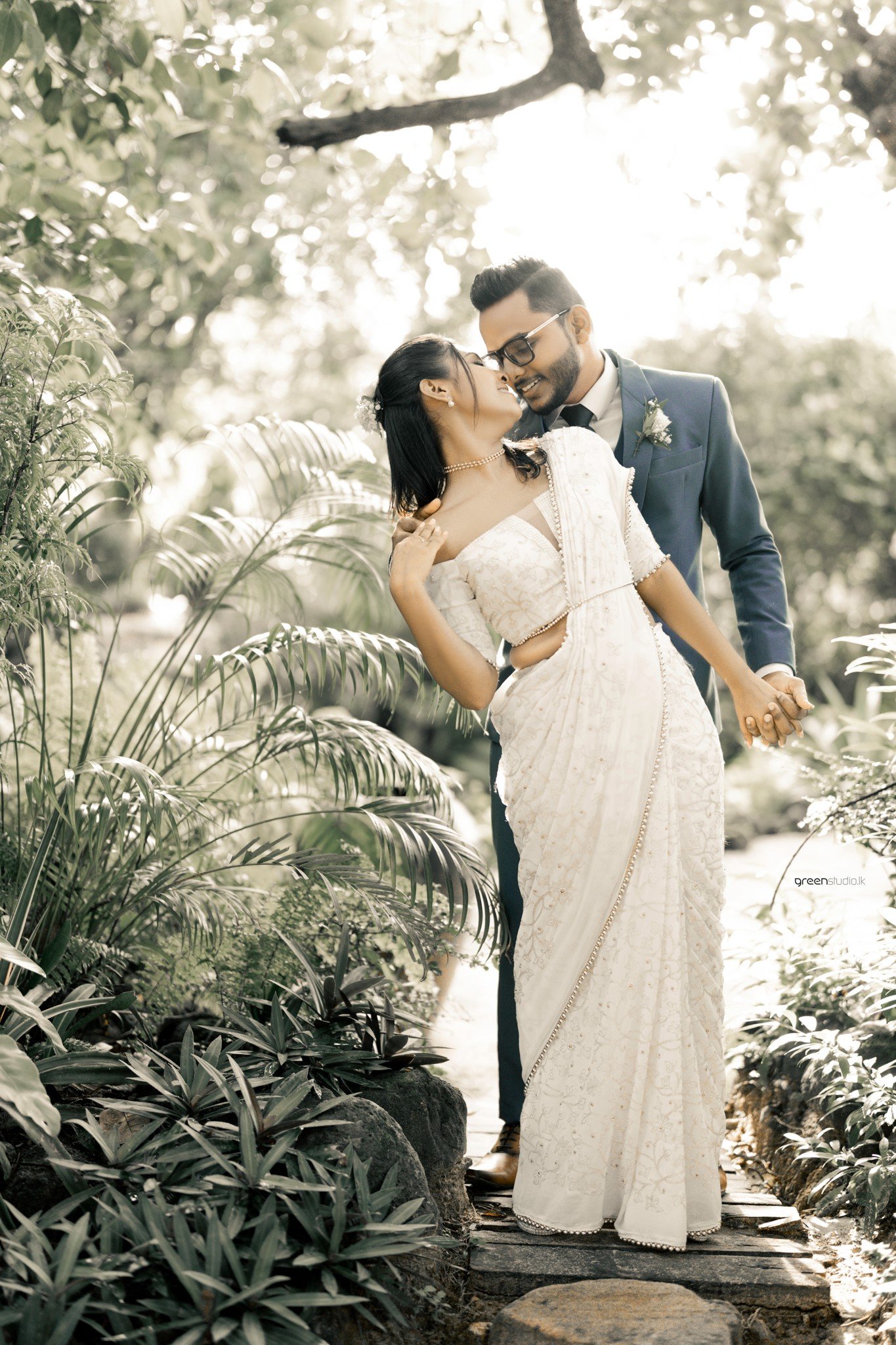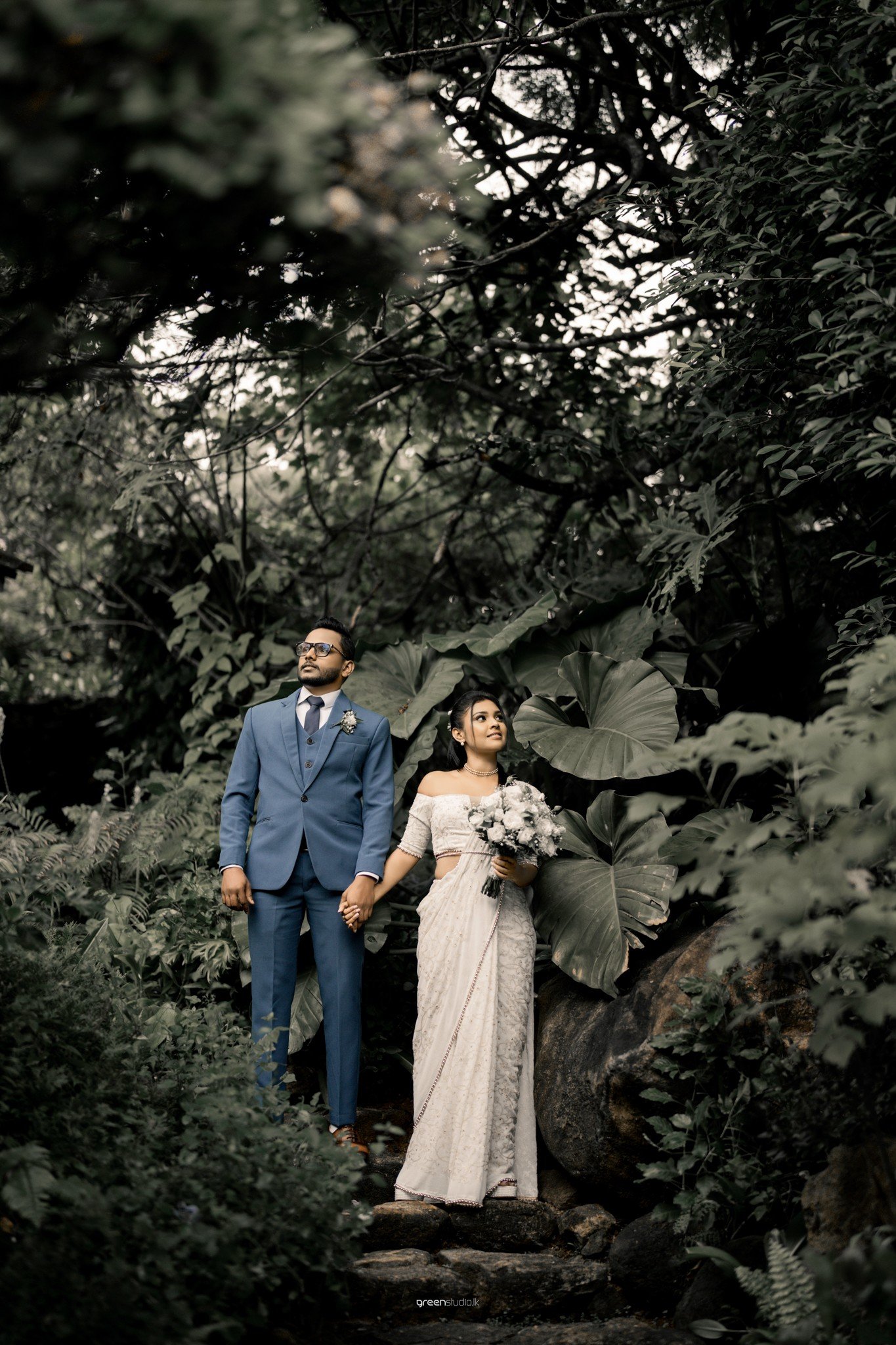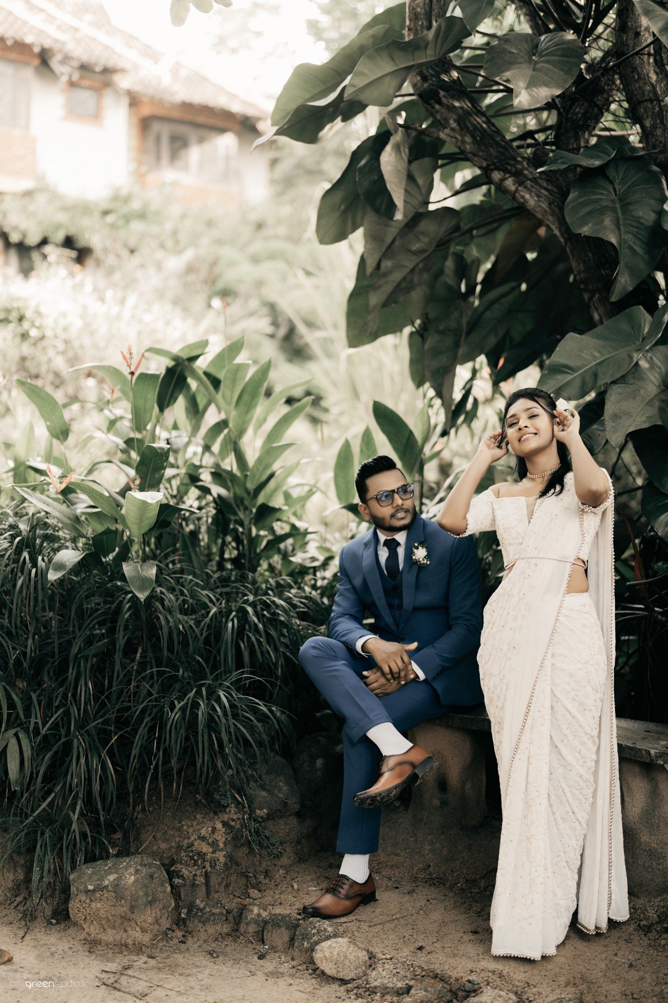Deeper in the foliage, giant leaves made a natural chapel. They paused, fingers laced, eyes lifted as if listening for the future. There were playful beats too: a quick fix of a wayward pleat, a brush of earrings while he sat, amused and adoring, beside a tangle of emerald plants.