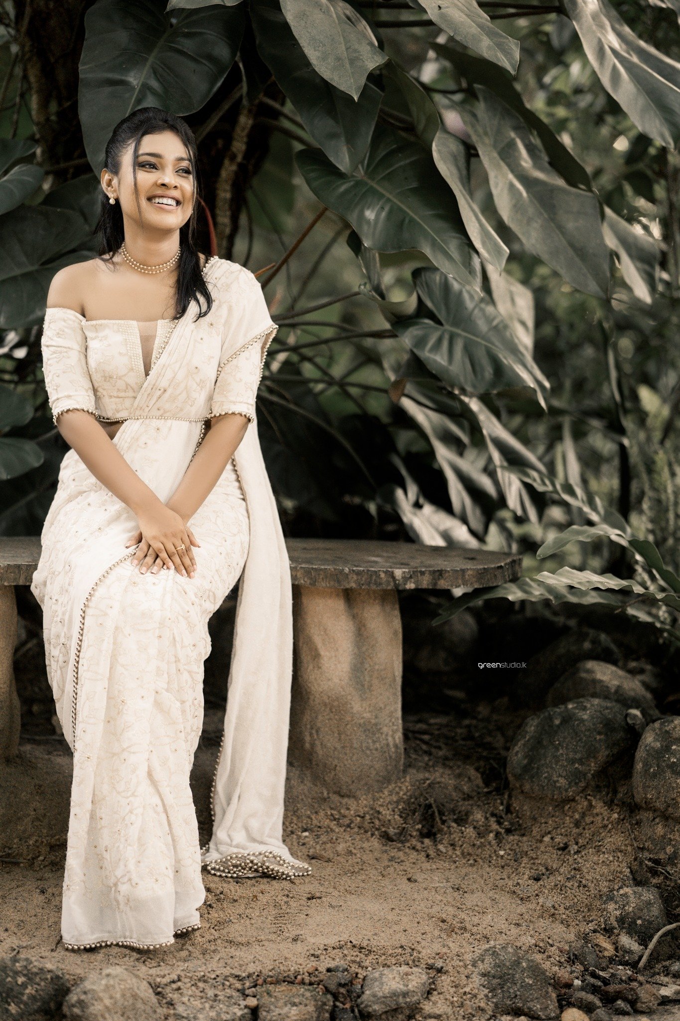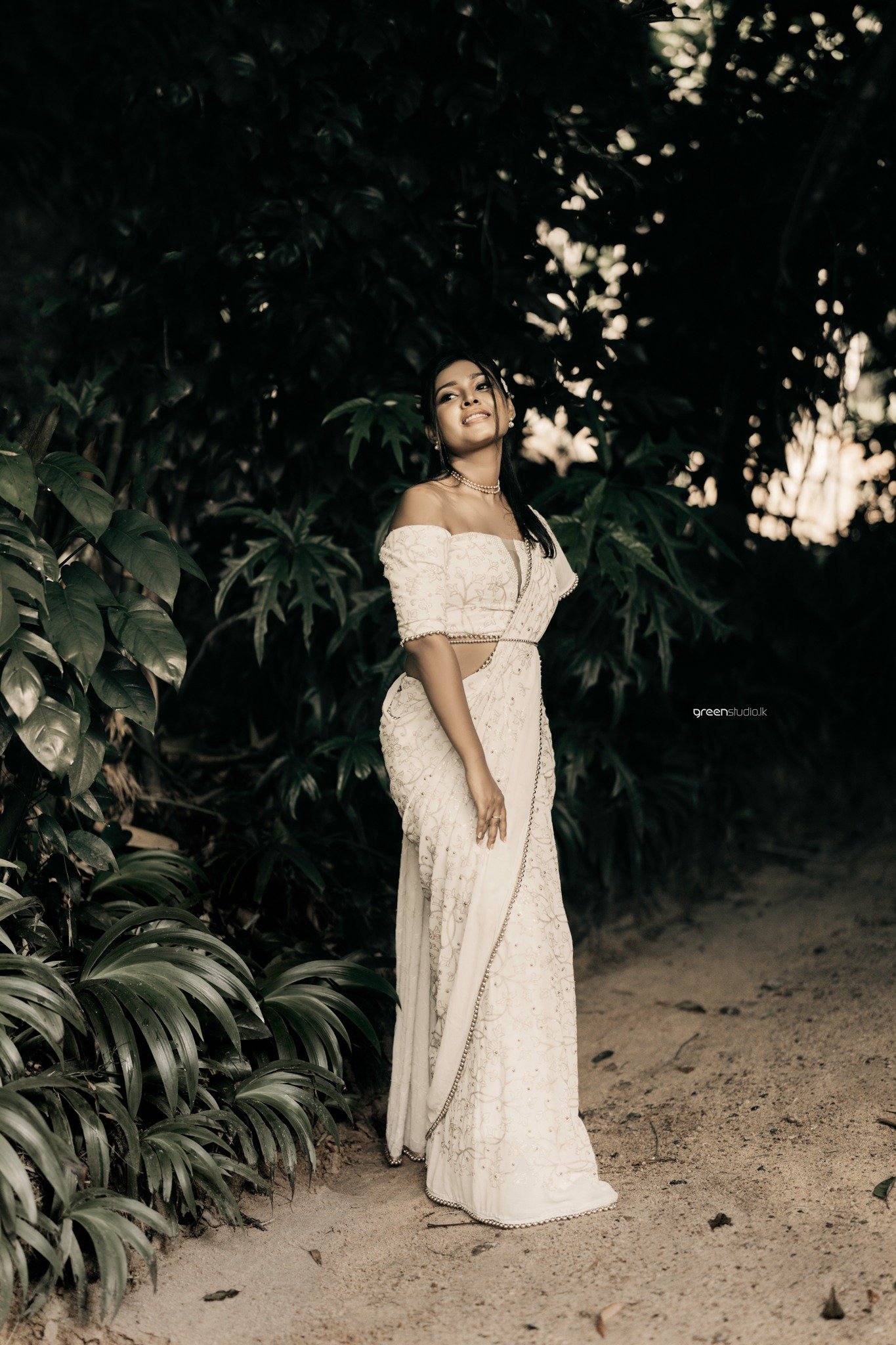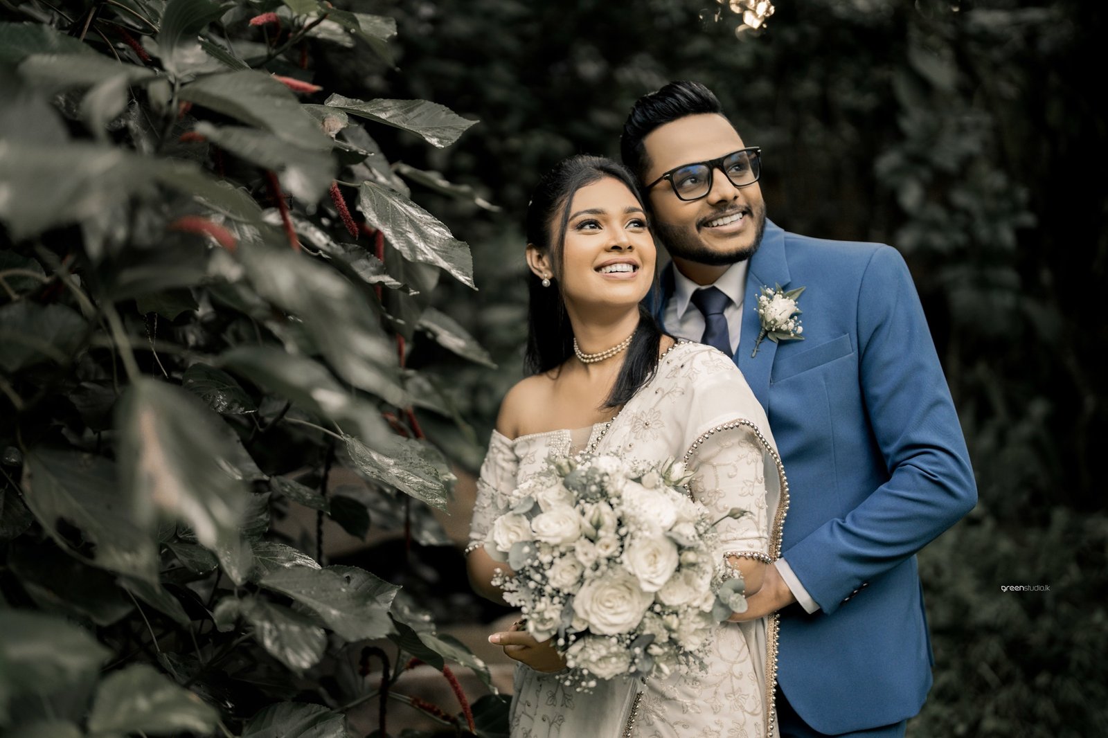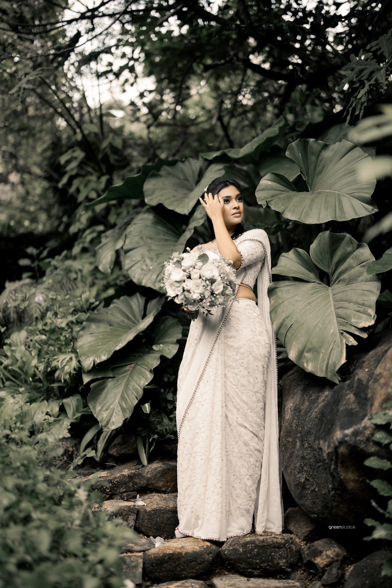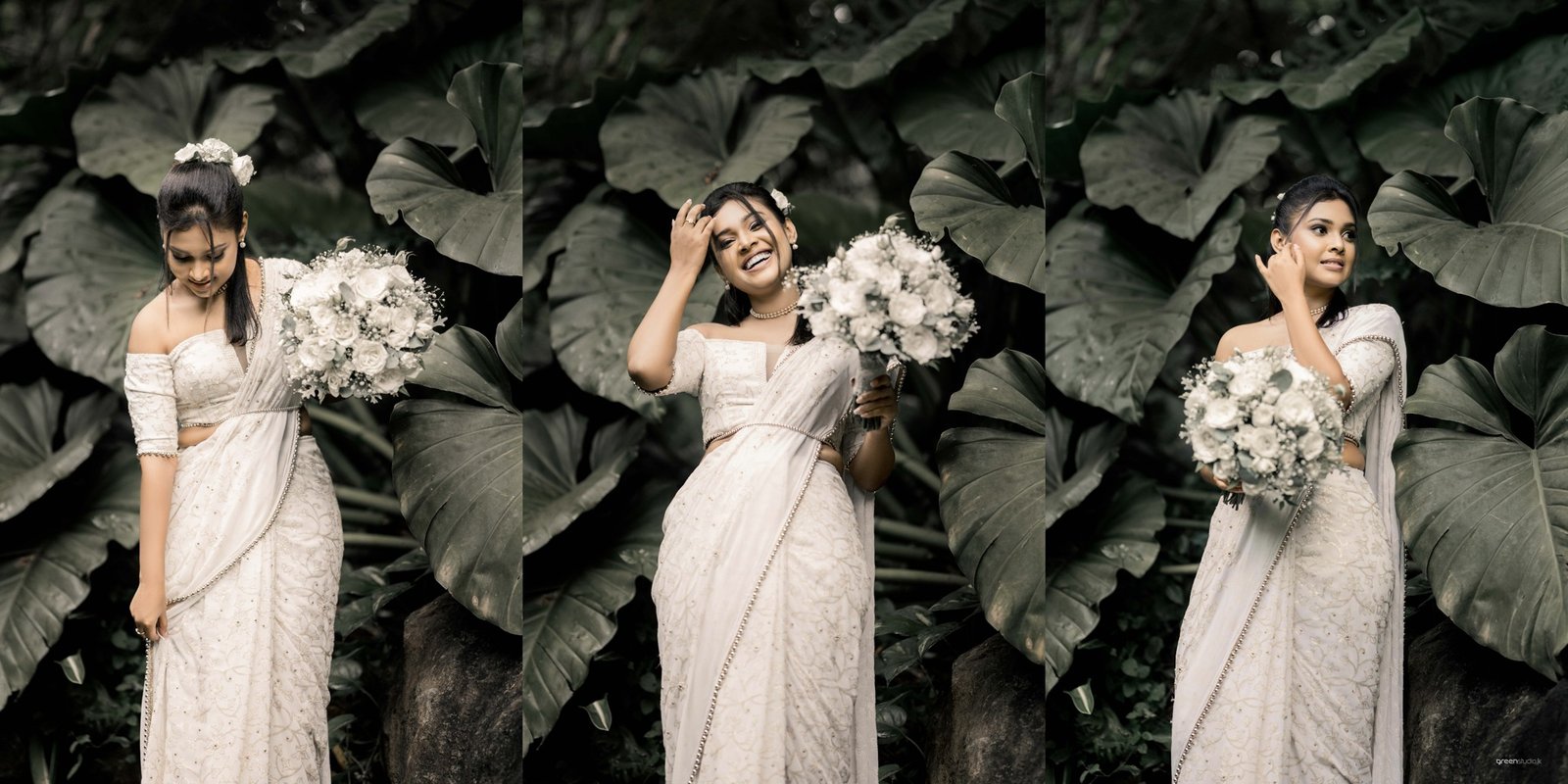 Deeper in the foliage, giant leaves made a natural chapel. They paused, fingers laced, eyes lifted as if listening for the future. There were playful beats too: a quick fix of a wayward pleat, a brush of earrings while he sat, amused and adoring, beside a tangle of emerald plants.