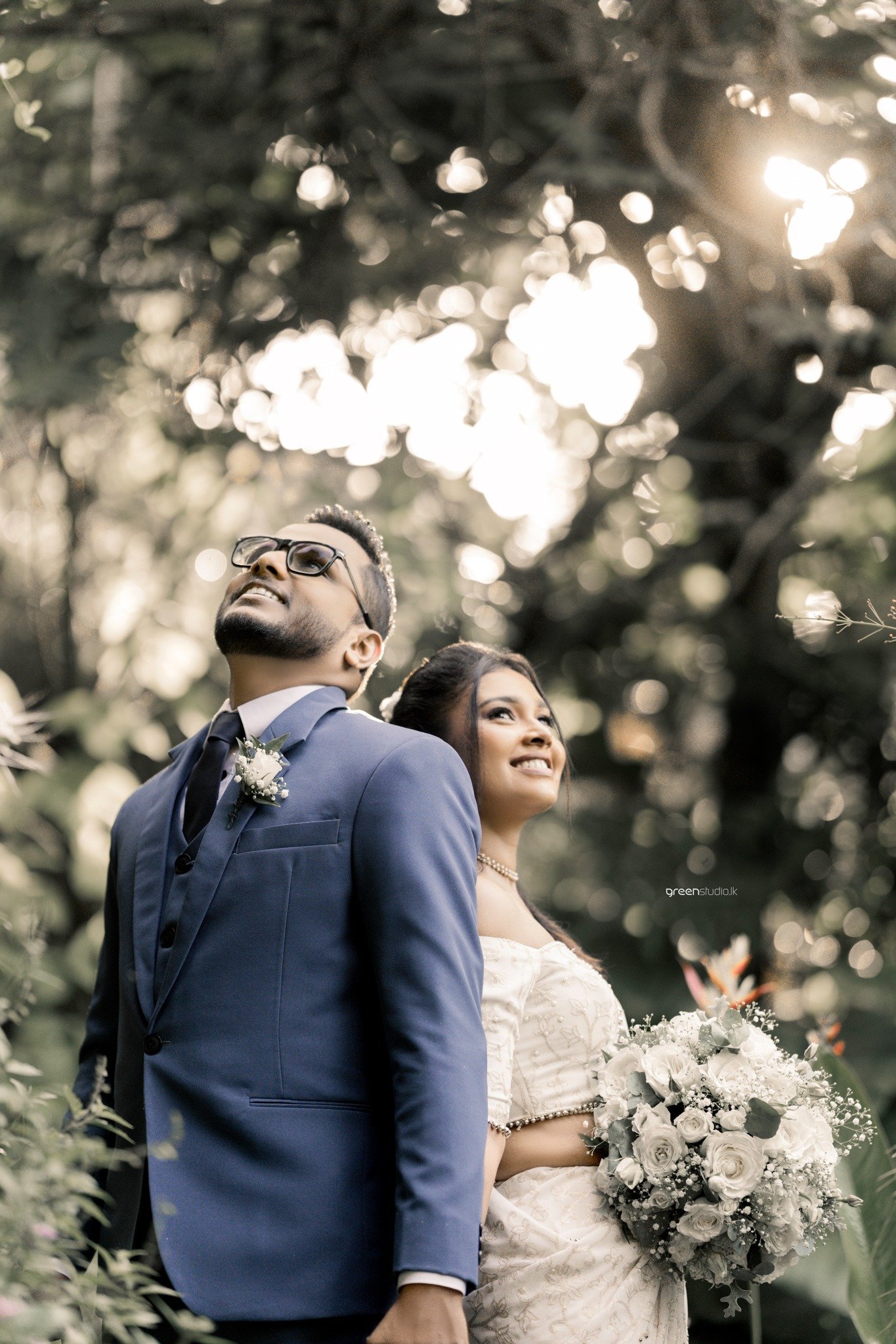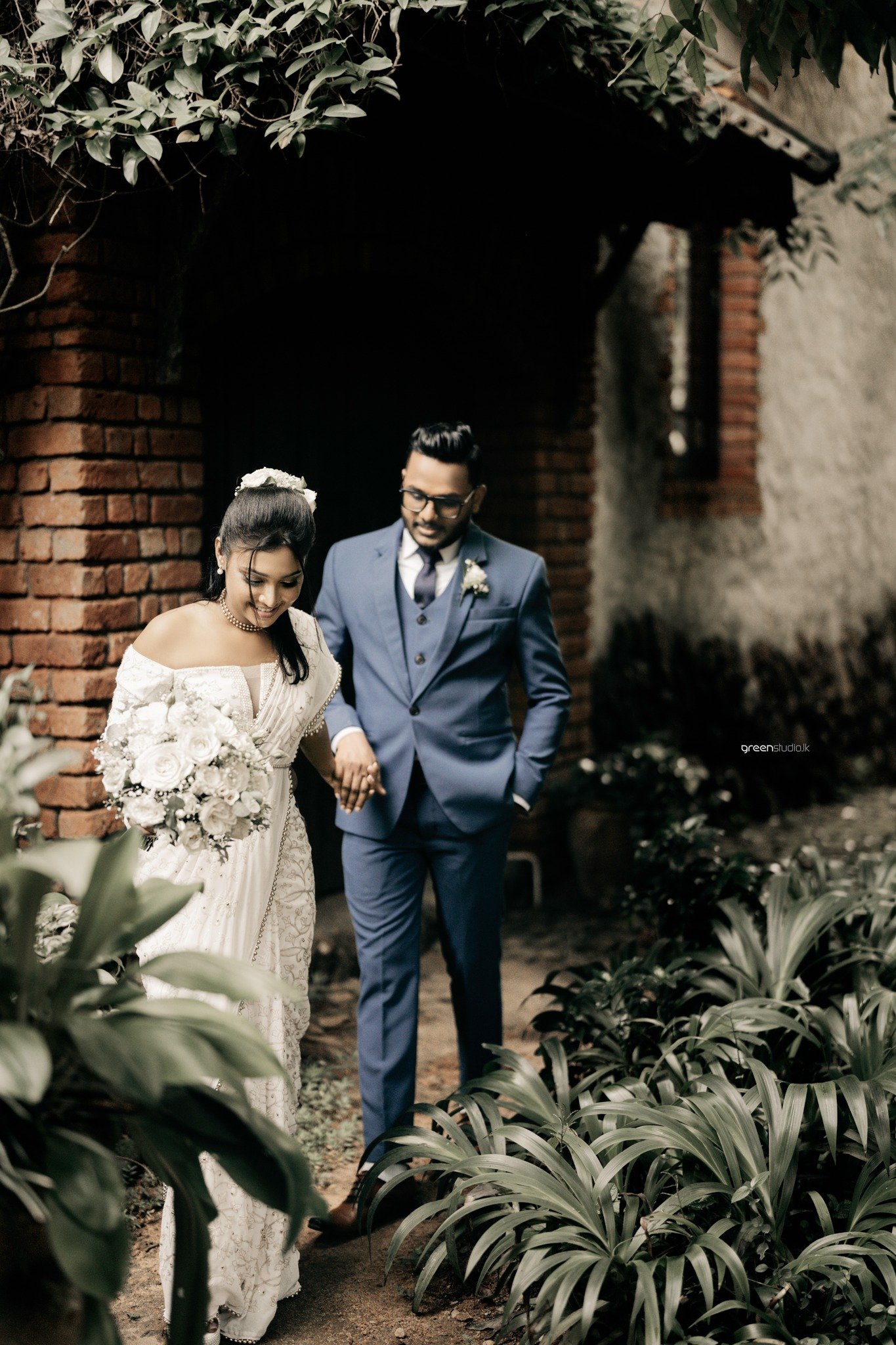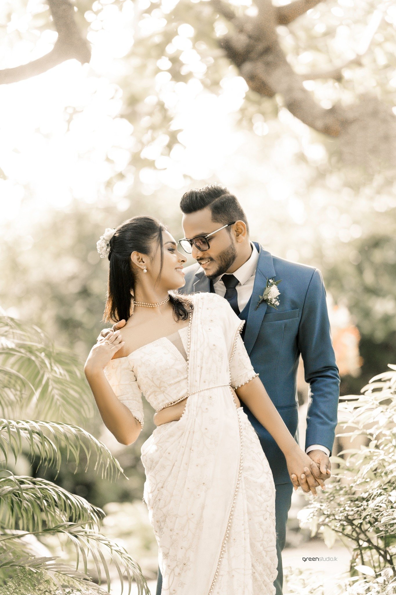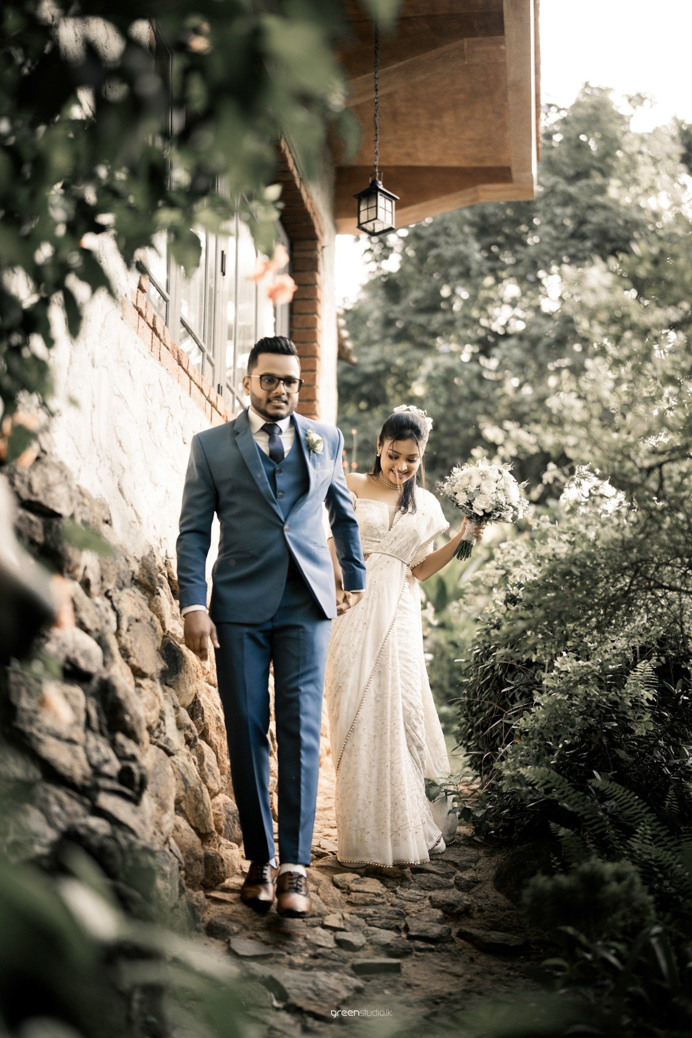 Under a lace of leaves and late-day sun, they leaned back-to-back and breathed in the moment—his sharp blue suit against her pearl-embroidered saree, a bouquet of soft whites cradled between them. Hand in hand they wandered down a stone path, the house and hanging lantern framing their quiet excitement. In the garden’s hush she twirled—shoulders kissed by light—while he watched with the soft smile of a man already home.