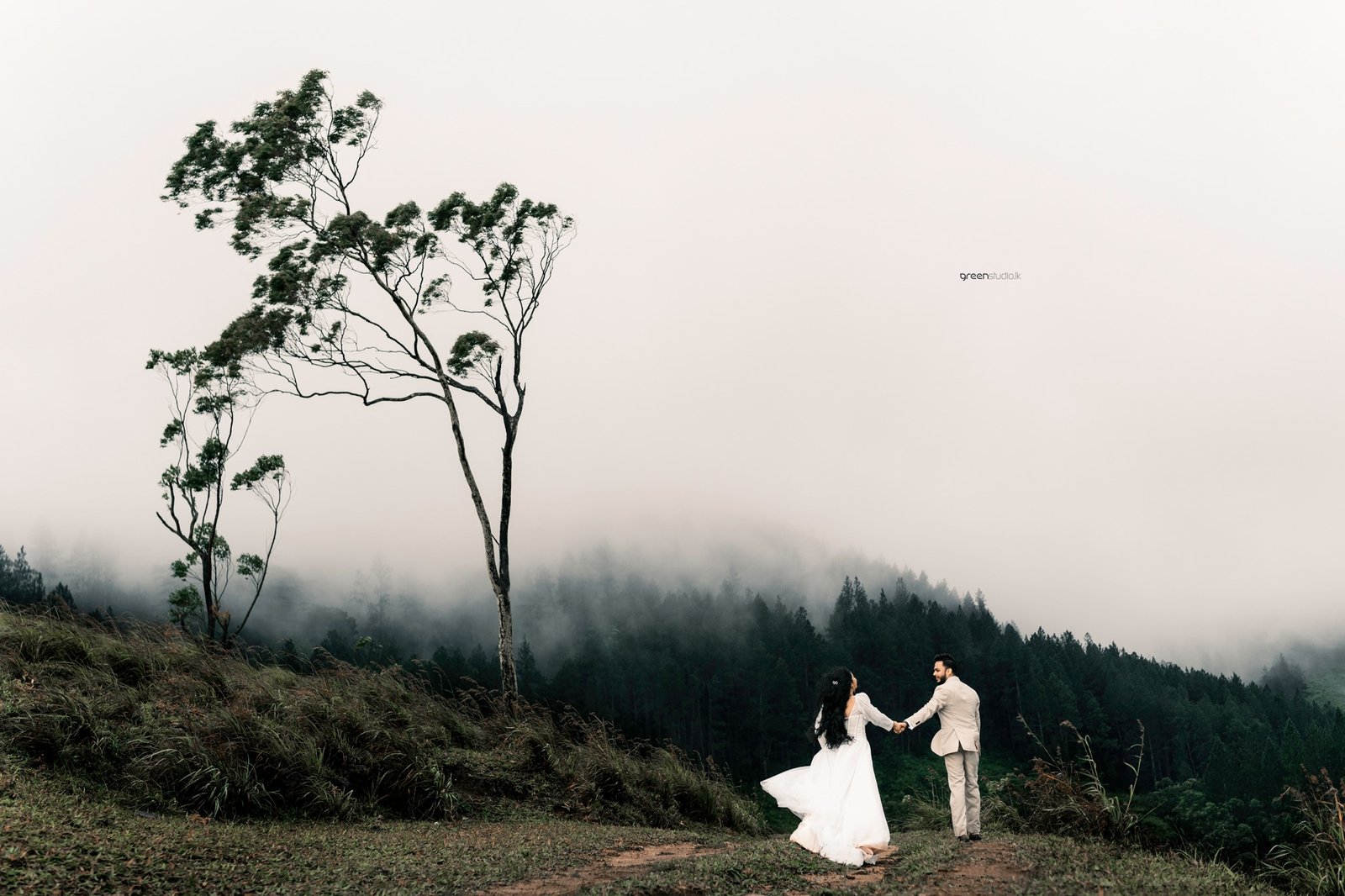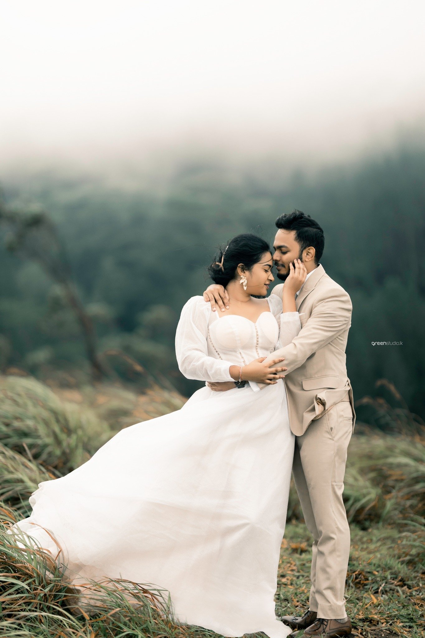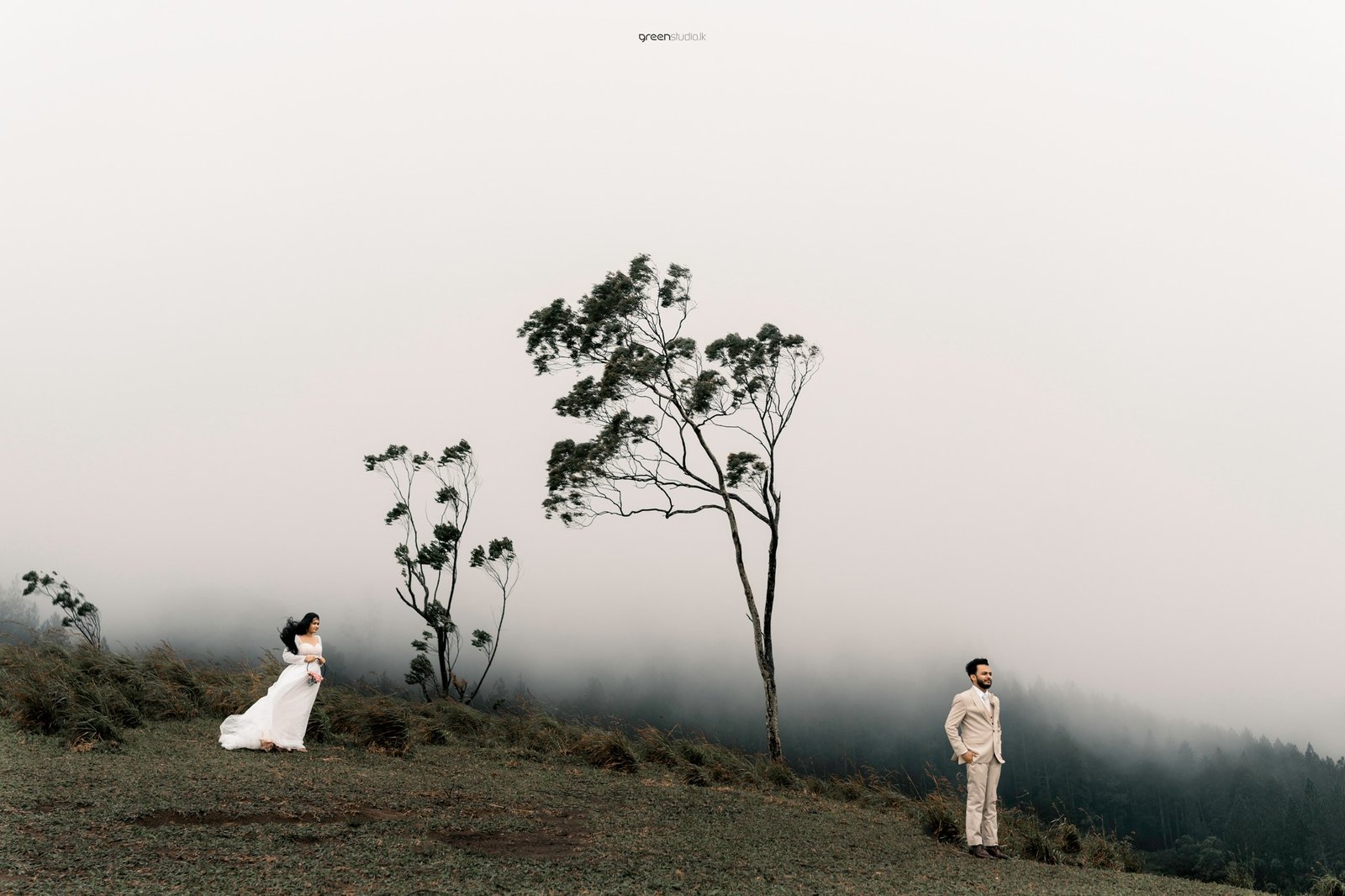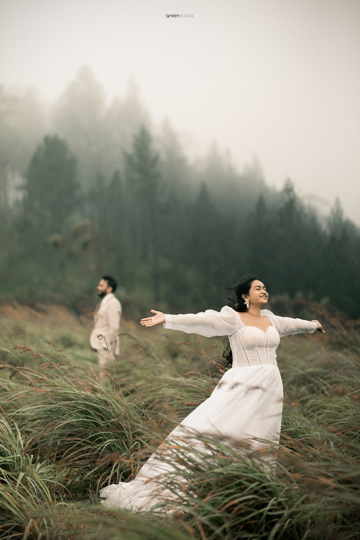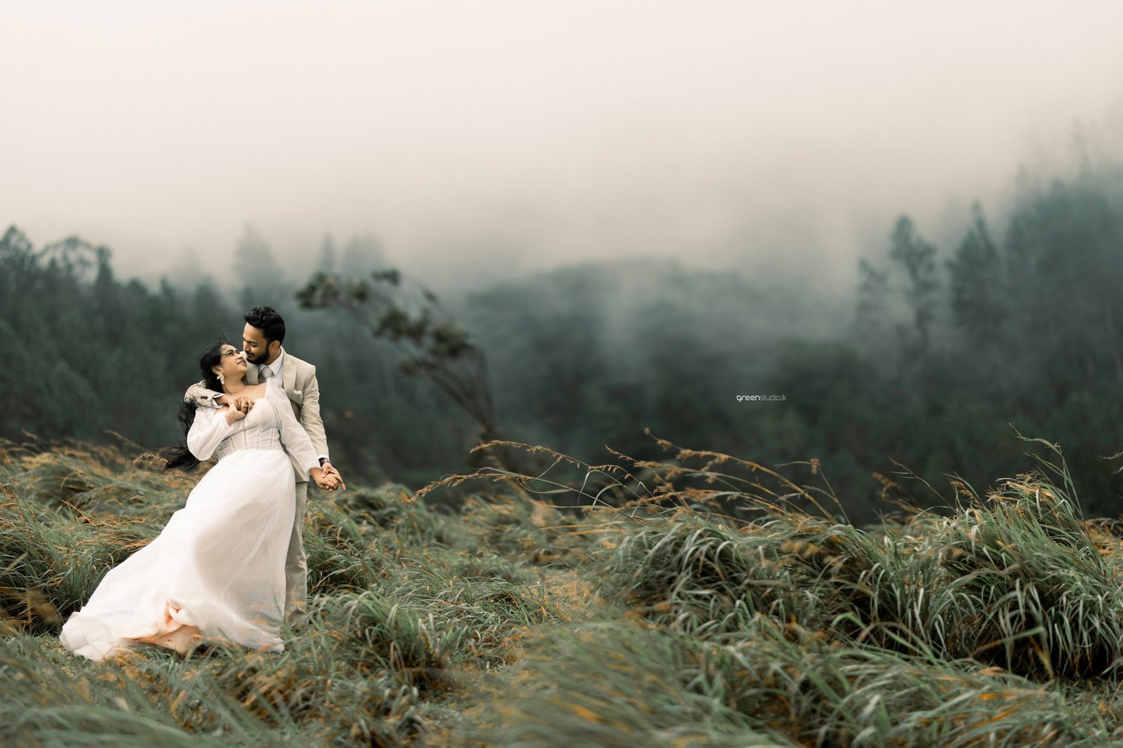 Set against the breathtaking backdrop of mist-covered mountains and windswept hills, these images capture a love story wrapped in serenity and nature’s embrace. The couple shares tender moments—holding hands, dancing, and laughing—while the fog weaves its magic around them. Flowing gowns, gentle touches, and the vast openness of the highlands create a poetic blend of romance and wilderness, turning every frame into a timeless memory.