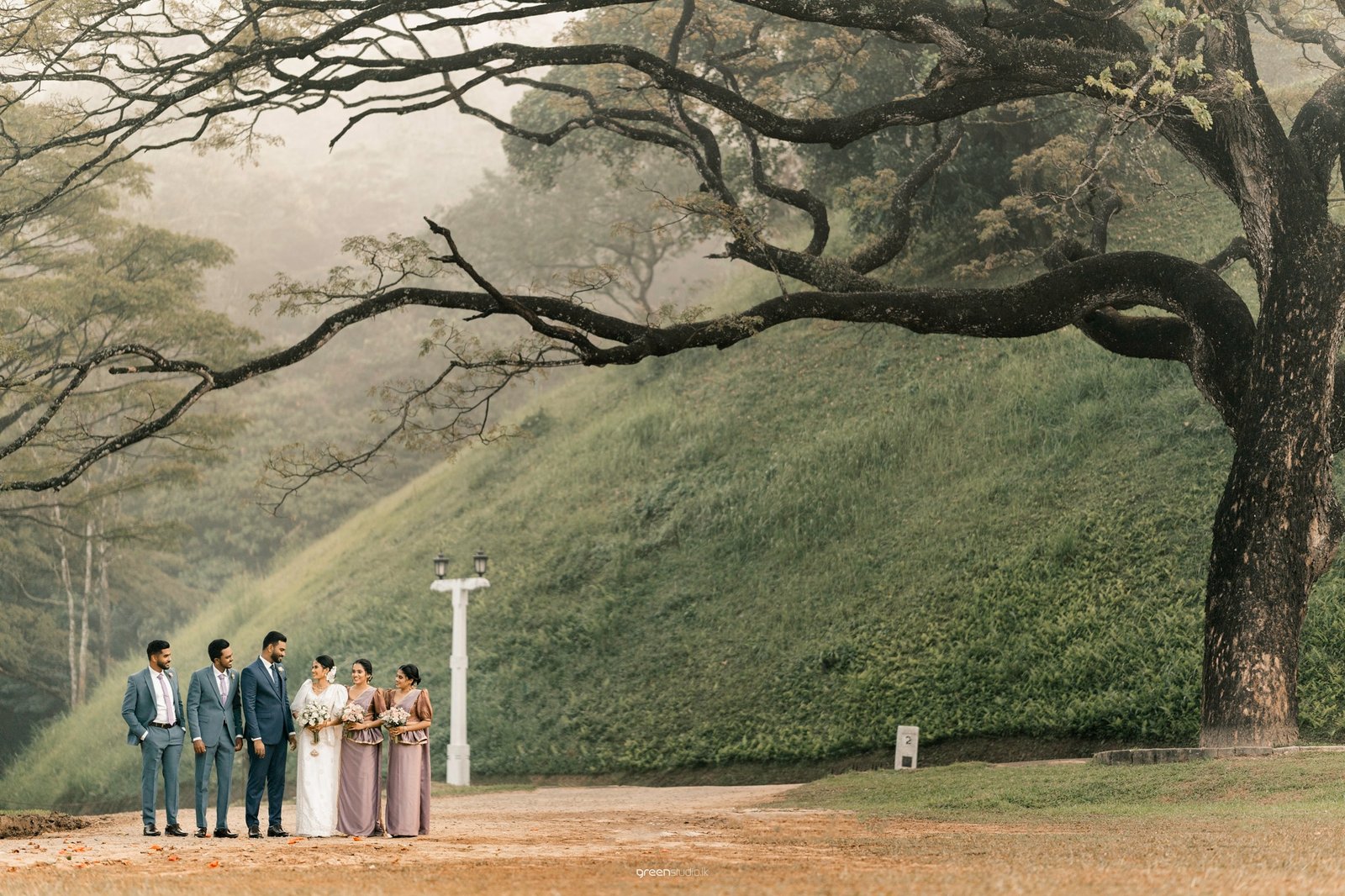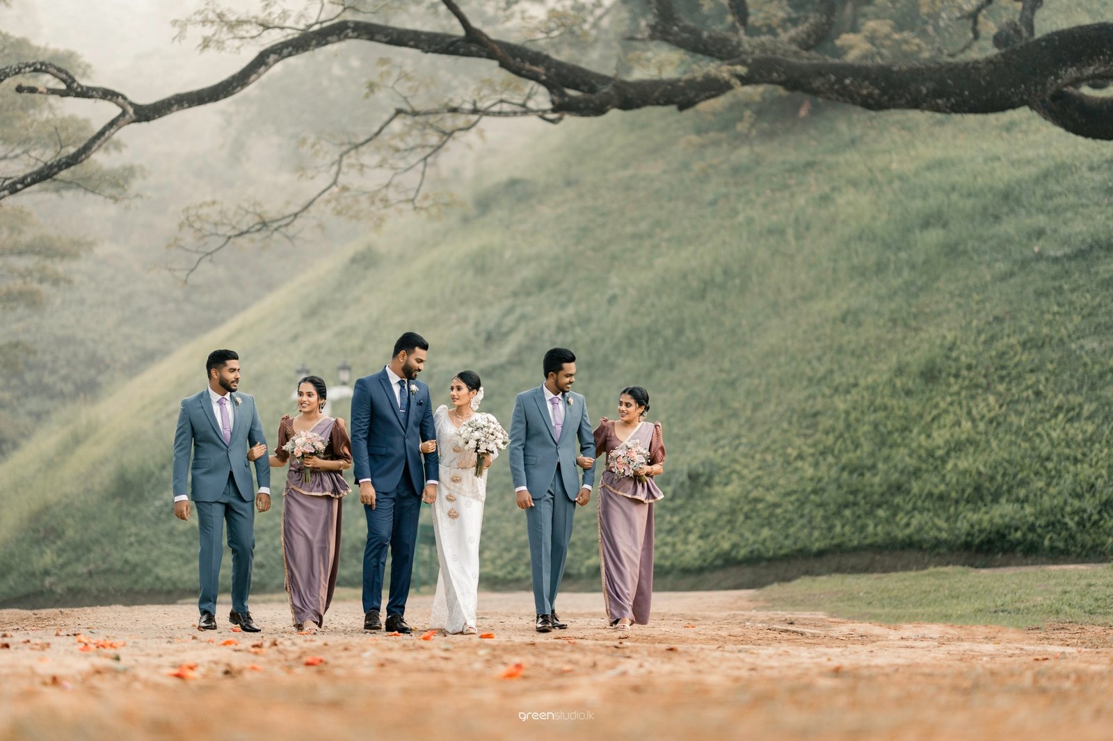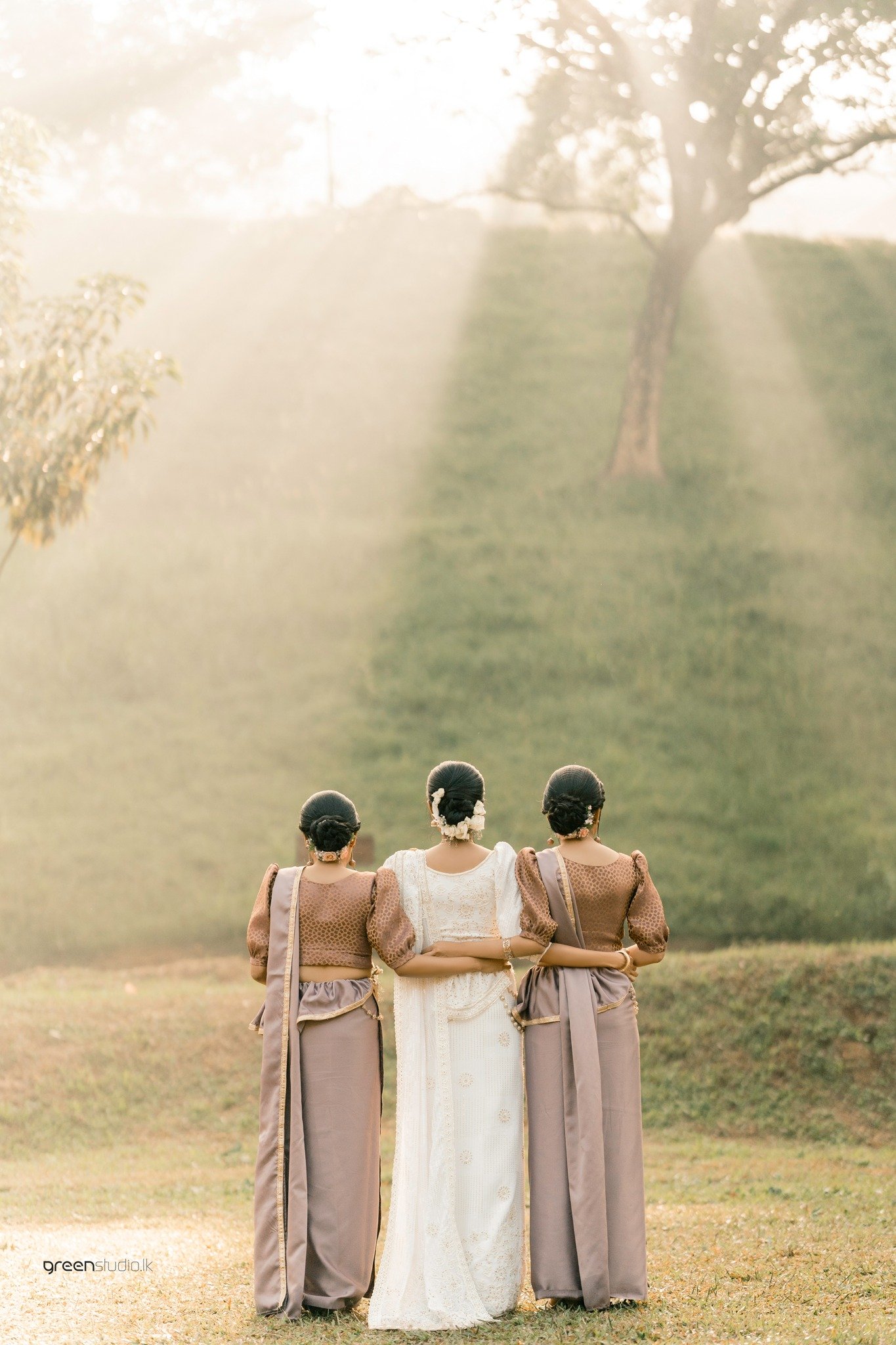 Her Kandyan saree shimmered with beadwork; orchids tucked into her bun, she looked up and the whole group fell into an easy walk, bouquets bouncing, jokes flowing.